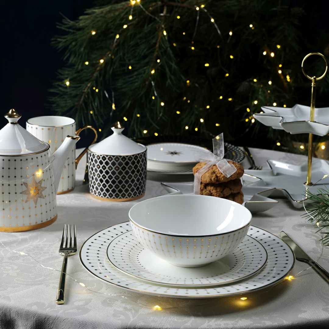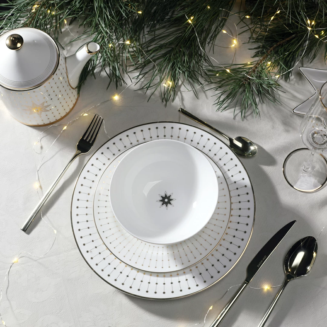«Азур золотой» – серия фарфора, вдохновленная волшебством новогодней ночи. Создать настроение праздника, украсить новогоднюю сервировку и привнести ноту уюта в любое торжество – все это возможно с помощью предметов серии «Азур золотой» автора – Юлии Гайлис (Чистякова).