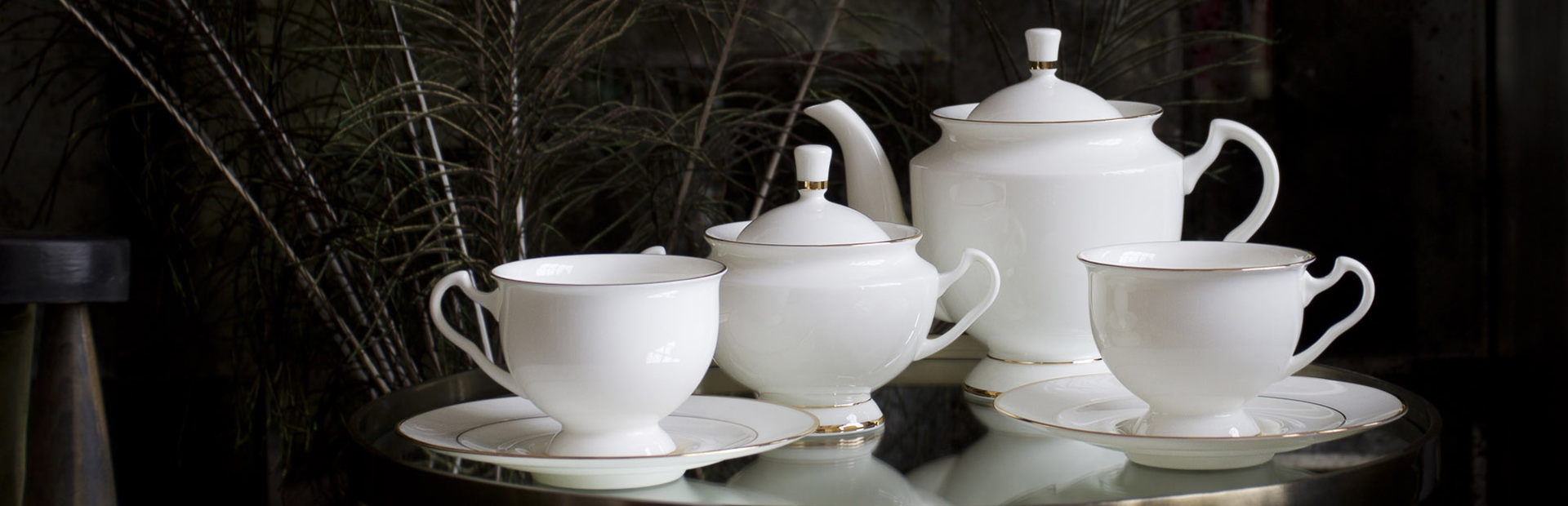 Костяной фарфор – идеальный материал для использования в быту, ведь производится он на основе натурального материала и не имеет пор. Благородное сочетание изысканной золотой отводки с белизной костяного фарфора гармонично впишется и в домашний, и в деловой интерьер, подойдет как для утреннего чаепития, так и для торжественного застолья. Разнообразие классических форм позволит выбрать фарфор по душе и показать Вашу индивидуальность. Кроме того, изделия из костяного фарфора коллекции «Золотая лента» станут универсальным подарком к любому празднику.