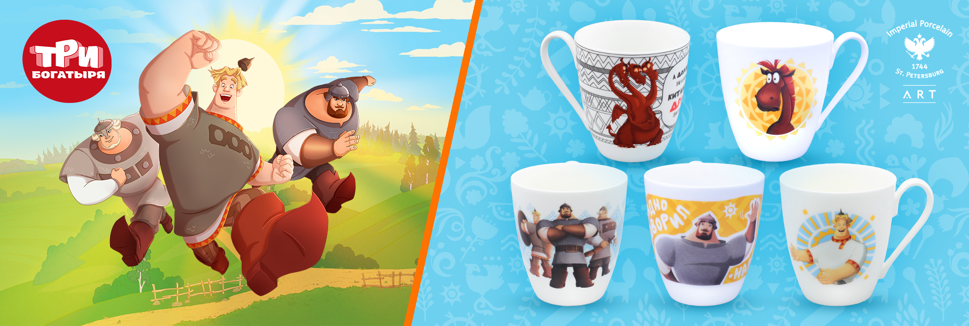 Императорский фарфоровый завод и студия «Мельница» представляют продолжение популярной коллекции «Три богатыря»! На фарфоре вновь появились главные герои одноименного анимационного сериала: Илья Муромец, Добрыня Никитич, Алеша Попович, Змей Горыныч и конь Юлий. Как и прежде, былинные персонажи увлекут в неповторимую атмосферу русских сказок и удивительное путешествие с головокружительными приключениями. Яркие образы полюбившихся героев дополнены забавными, характерными для них фразами.