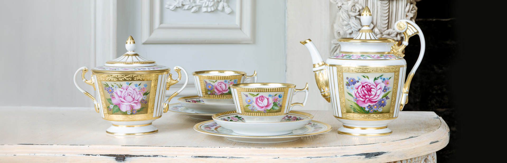 Коллекция создана в лучших традициях мастеров Императорского фарфорового завода. Роспись предметов – праздничная и торжественная – выполняется исключительно вручную и представляет собой композиции из пышных букетов и отдельных цветов в богатом золотом обрамлении.