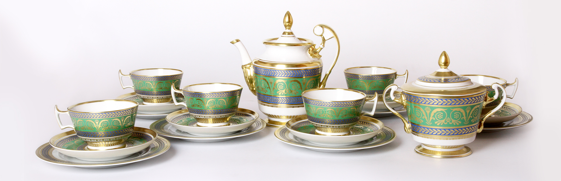 В основу декора коллекции положена роспись сервиза, изготовленного на Императорском фарфоровом заводе в 1828 году. Созданный для императрицы Марии Федоровны, исторический сервиз использовался в Гатчине как парадный. В росписи применены синие и зеленые тона, с нанесенным на них изысканным растительным орнаментом. Предметы коллекции богато декорированы золотом с филигранной гравировкой полудрагоценным агатом.