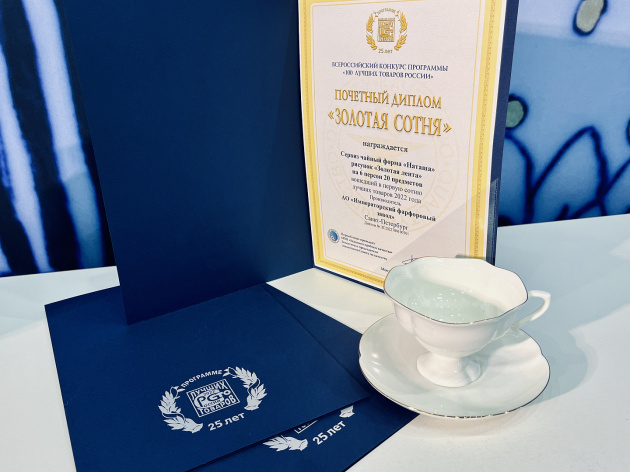 Наш чайный сервиз на форме «Наташа» с рисунком «Золотая лента» вошел в первую сотню лучших товаров России 2022 года. Почетное звание было получено в ходе участия во всероссийском конкурсе «100 лучших товаров России».