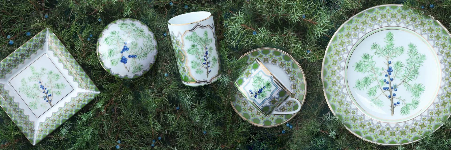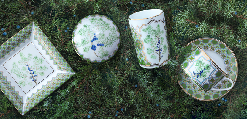 ИФЗ вновь радует ценителей «Императорского фарфора» продолжением коллекции «Цветы и ягоды России». Новая серия «Можжевельник ароматный» от художника Ольги Будашовой выполнена в эстетике винтажных ботанических иллюстраций и дополнена орнаментальным узором – авторским размышлением на тему национальной вышивки.
