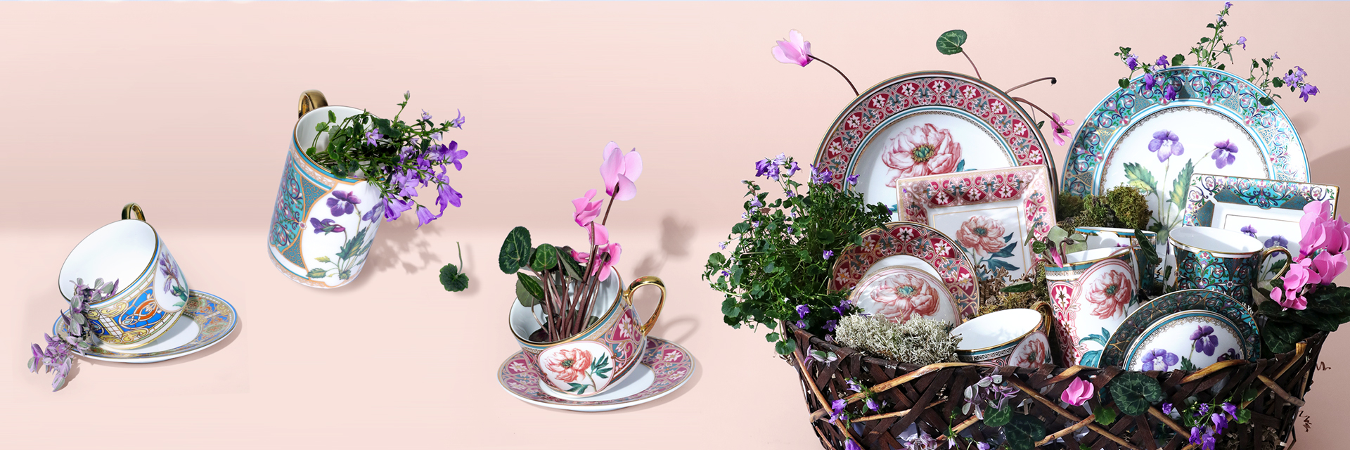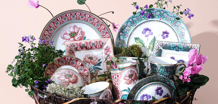 В коллекцию вошли бокалы и чайные пары, декоративные тарелки, подставки для мелочей и шкатулки из твердого фарфора.