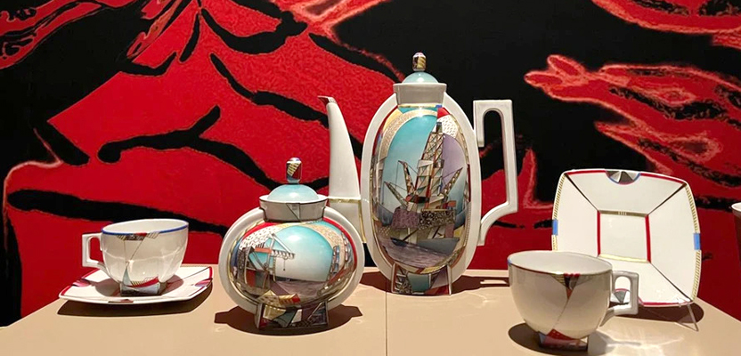 В экспозиции представлены и совсем недавние произведения, в которых отражено стремление к поиску новых форм и сюжетов. Например, в дар Музею современной истории России при содействии компании «Транснефть» передан уникальный сервиз «Нефть», изготовленный в 2024 г. и состоящий из 7 предметов (чашки с блюдцами, тарелки, кофейник и сахарница).