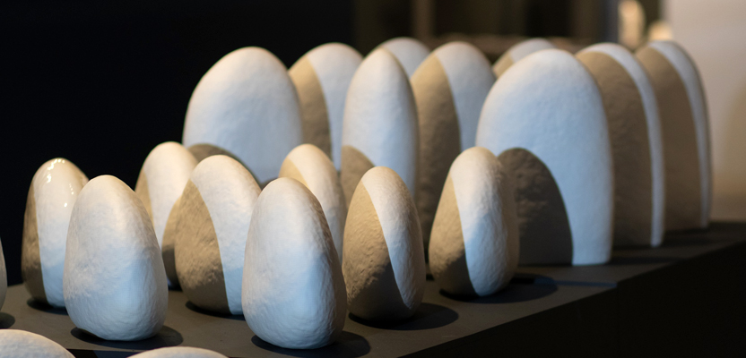 На выставке представлены новые работы Юлии Жуковой: чайно-кофейные и столовые комплекты, вазы, подсвечники и уникальная коллекция фарфоровых камней. Также в экспозицию включены авторские коллажи и эскизы к некоторым из представленных коллекций. Особую атмосферу создает световое оформление, похожее на неспешное течение реки в горном ущелье.