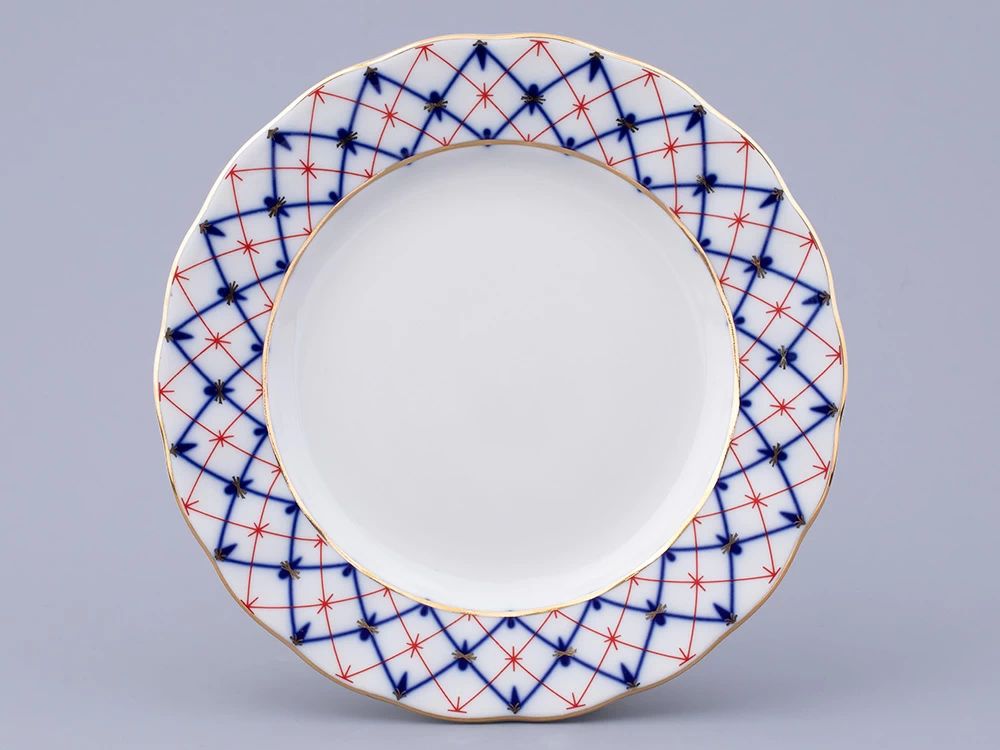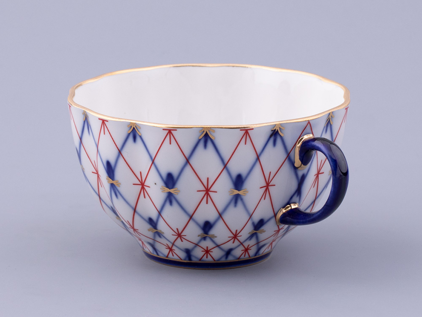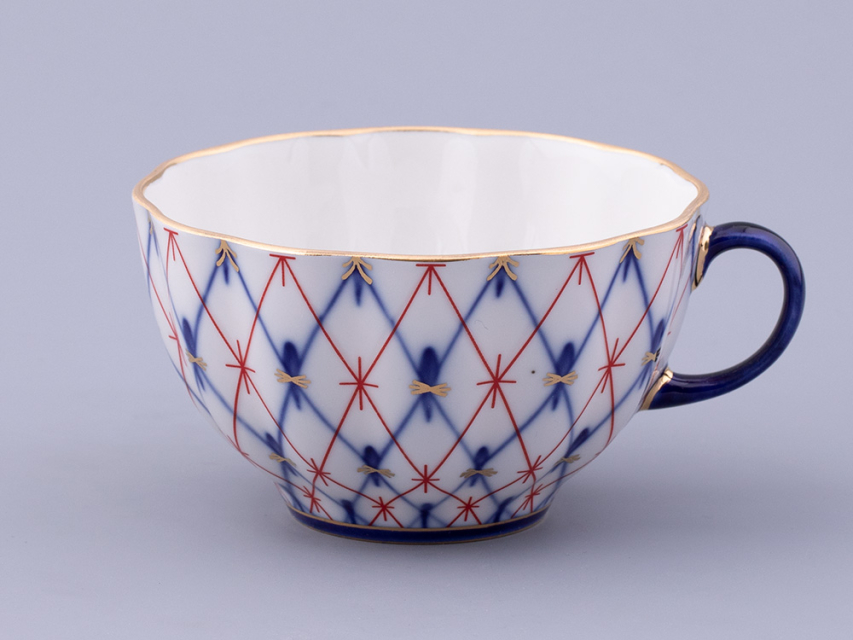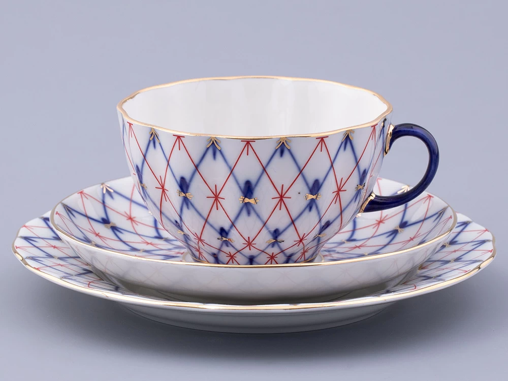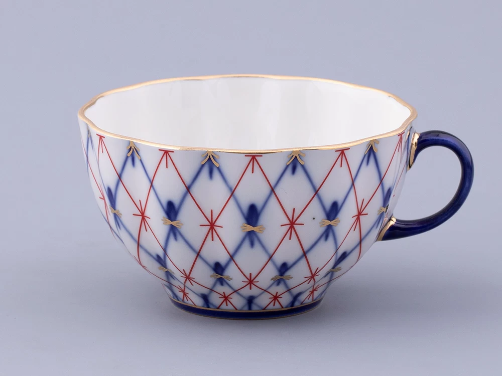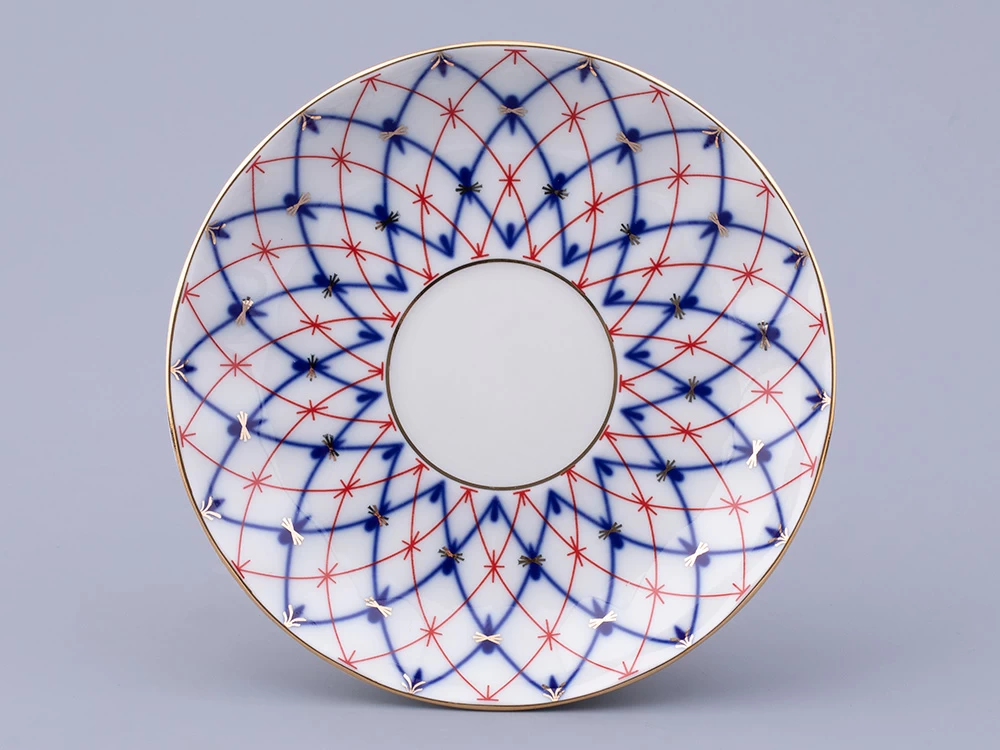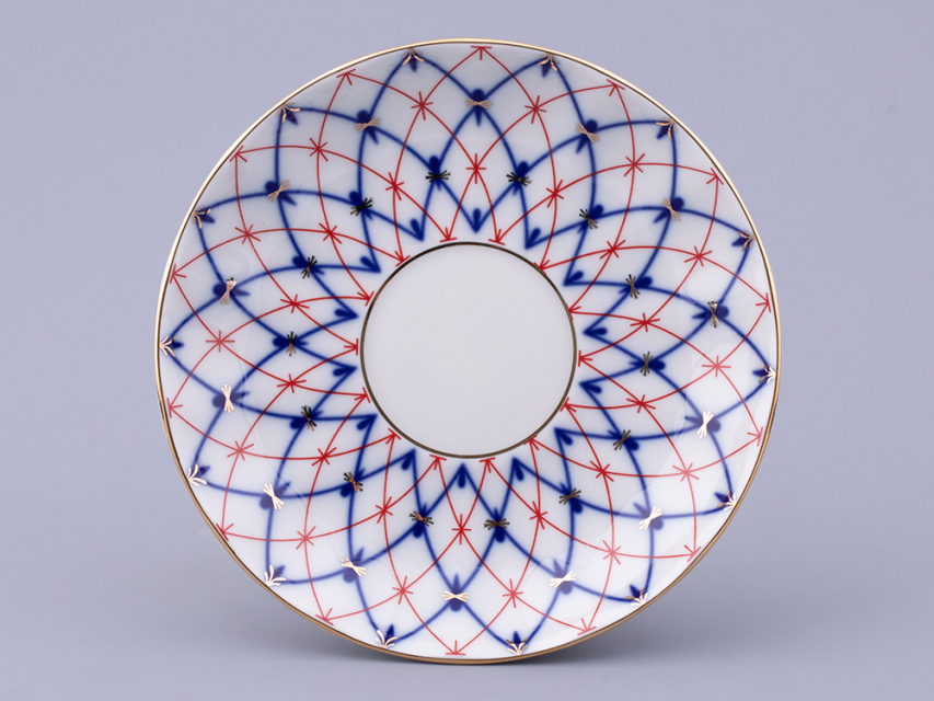 «Сетка 1950» – новый взгляд на один из шедевров великой Анны Яцкевич. Форма «Тюльпан» расположила на себе ритмичный сетчатый орнамент. Простое и, одновременно, оригинальное решение составляют два контрастных классических цвета: красный и синий. Их сдержанный «диалог» по-новому обыгрывает спокойную дольчатую форму. Такой декор, дополненный золотыми акцентами и насыщенным кобальтом ручки чашки, рождает стильный комплект на все времена.
