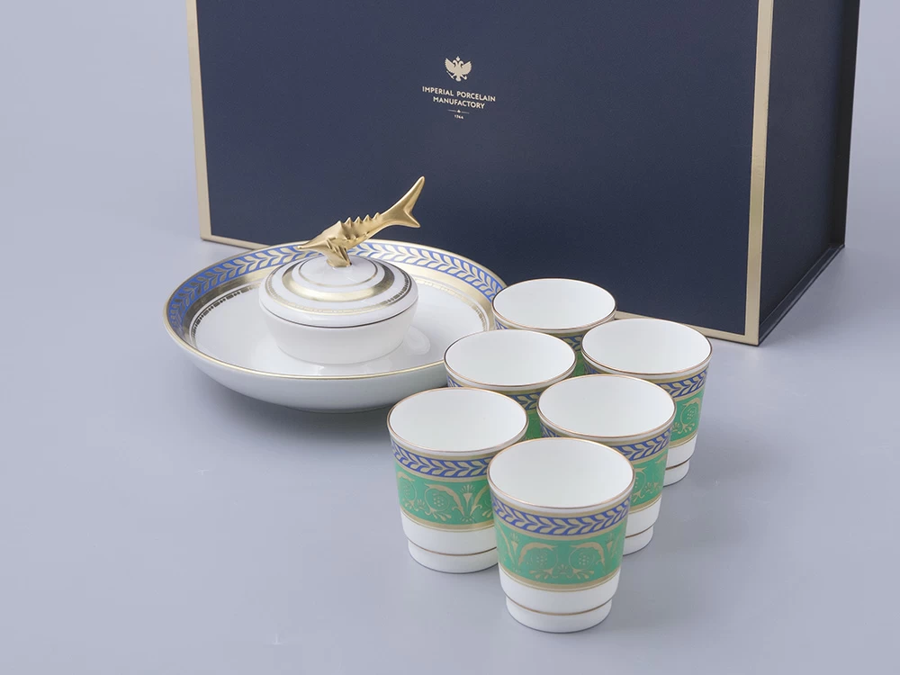 Роспись - растительная композиция - воссоздана по образцу сервиза первой половины XIX века из коллекции Государственного Эрмитажа. Стопки и икорница представлены в премиальной упаковке.