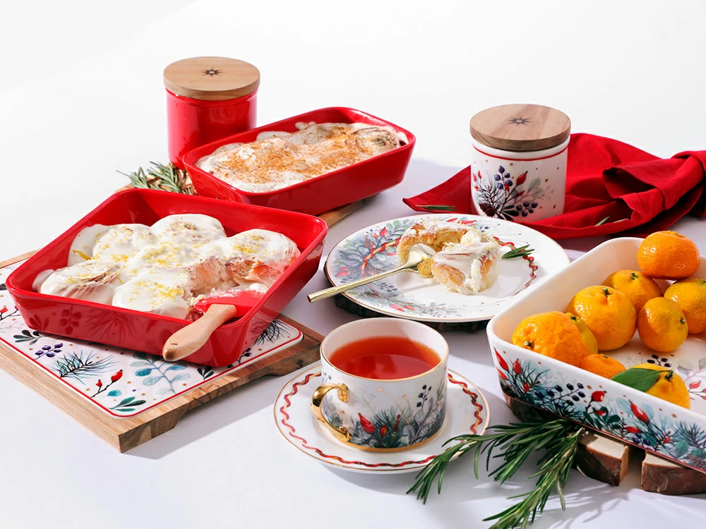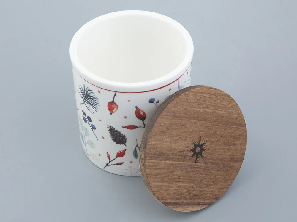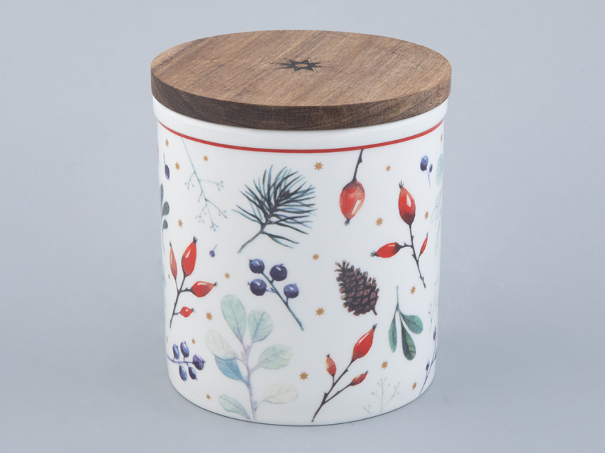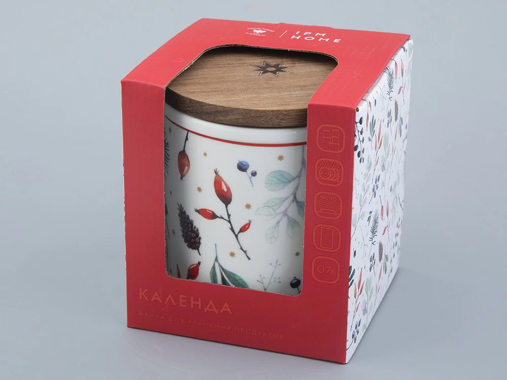 Банка с крышкой «Календа» – функциональная и красивая посуда, созданная для хранения и приготовления ваших любимых блюд. Изделие стало продолжением популярной одноименной коллекции чайного и столового фарфора. Как и на других предметах коллекции, основным декоративным мотивом является использование растительных мотивов: ягод и веточек хвойных деревьев.