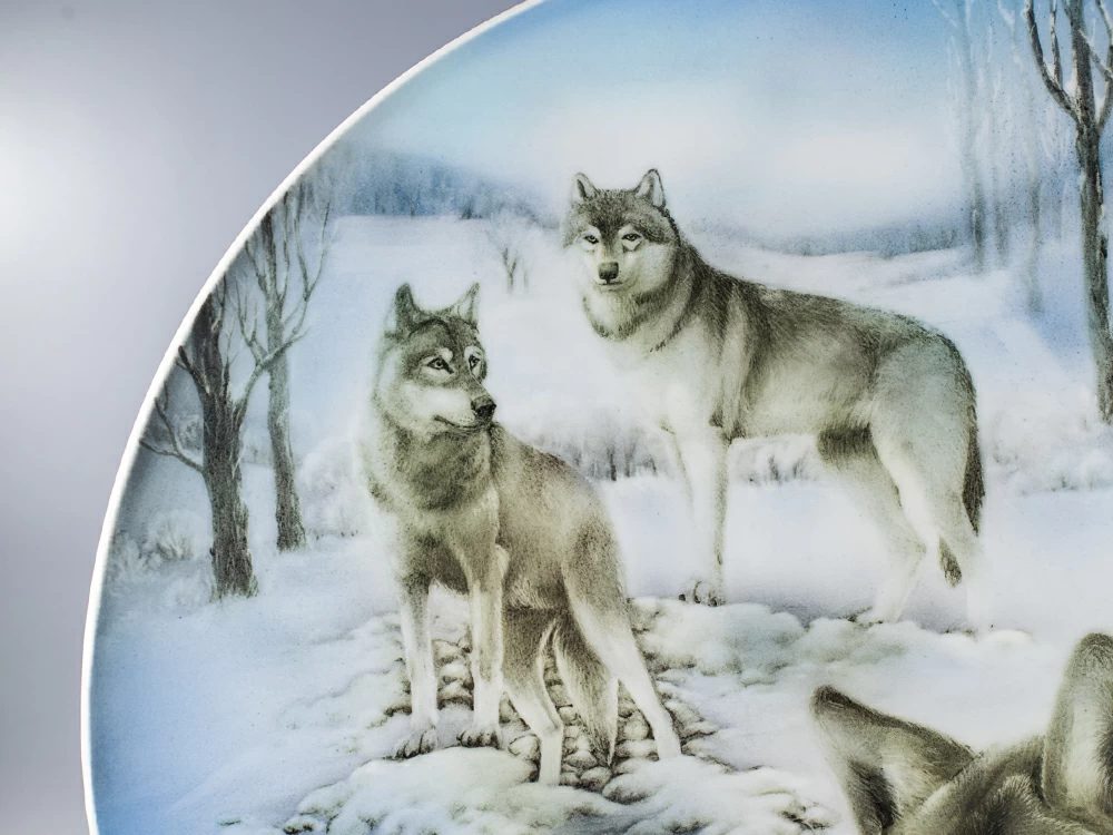 Всего несколько линий и цветовых акцентов на фарфоре, и белоснежная поверхность превращается в зимний пейзаж, покрытый снегами. Главные персонажи уникальных произведений представленной серии – волки, благородные животные северных широт, известные своей нехарактерной для животного мира приверженностью к семейности, оживляют каждую композицию серий. Время суток ярко и выразительно передано в росписях: на одной из ваз – северный закат, когда вся линия горизонта играет тёплыми красками, отражаясь в снежных сугробах, нежно-голубое небо, изображенное на квадратном пласте, передает атмосферу зимнего ясного дня. В каждом произведении – точно схваченный мимолетный миг из многогранной жизни окружающего мира.