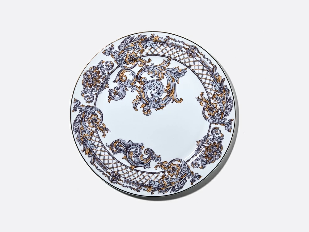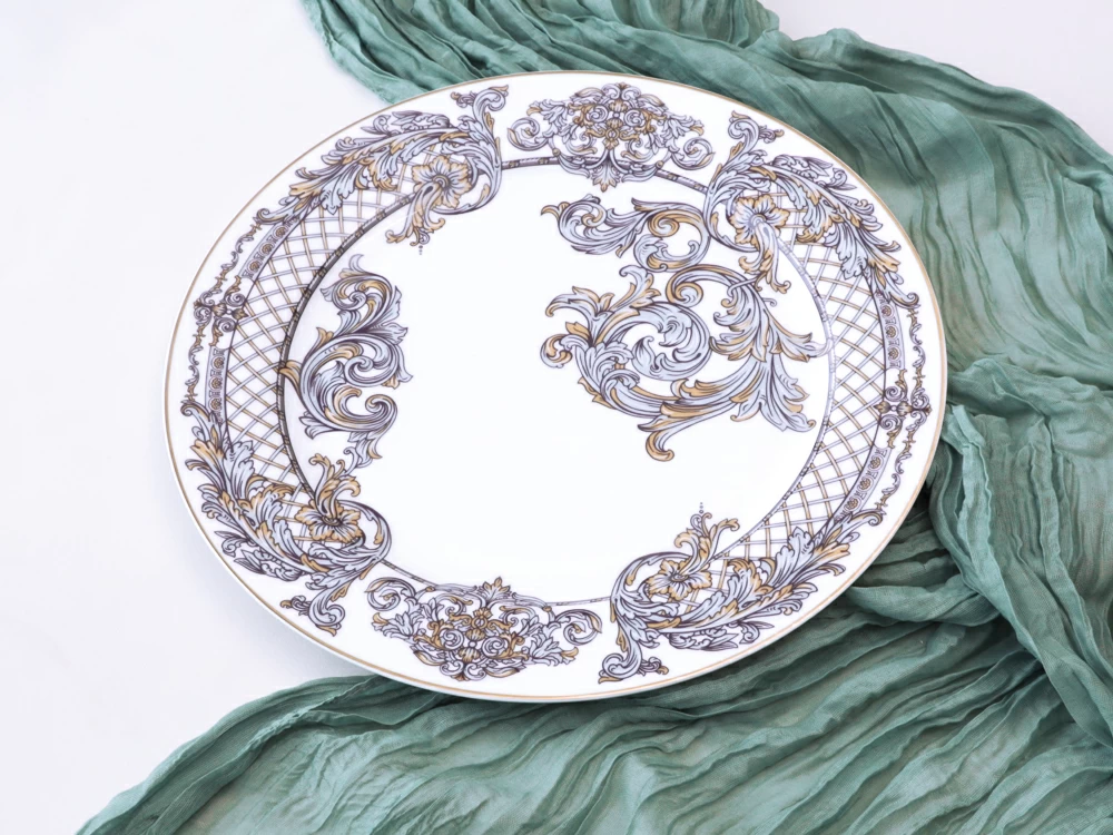 Круглое блюдо «Барокко» из костяного фарфора от художника Светланы Козлобродовой приглашает в эпоху роскоши. Белоснежный фарфор служит идеальным холстом для сложного декора, вдохновленного стилем барокко с его торжественностью и богатством орнамента.