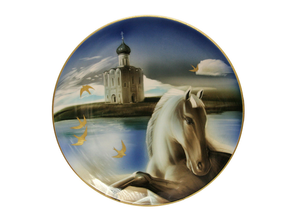Композиция «Покой и движение» Нелли Львовны Петровой – это слияние символического и реалистичного изображения. Величественные стены древнего храма и крепости, спокойствие воды и глубокая синева неба олицетворяют покой, которому противопоставлено движение, воплотившееся в динамичном образе грациозных лошадей. Объединить две противоположности помогли золотые ласточки, непринужденно порхающие в пространстве композиции. Роспись исполнена в одной из самых сложных техник подглазурной живописи с присущим ей эффектом смягчения очертаний фигур и предметов, когда под воздействием высокого огня контур рисунка становится слегка размытым, что позволяет передать дрожащий воздух и глубину пространства картины.