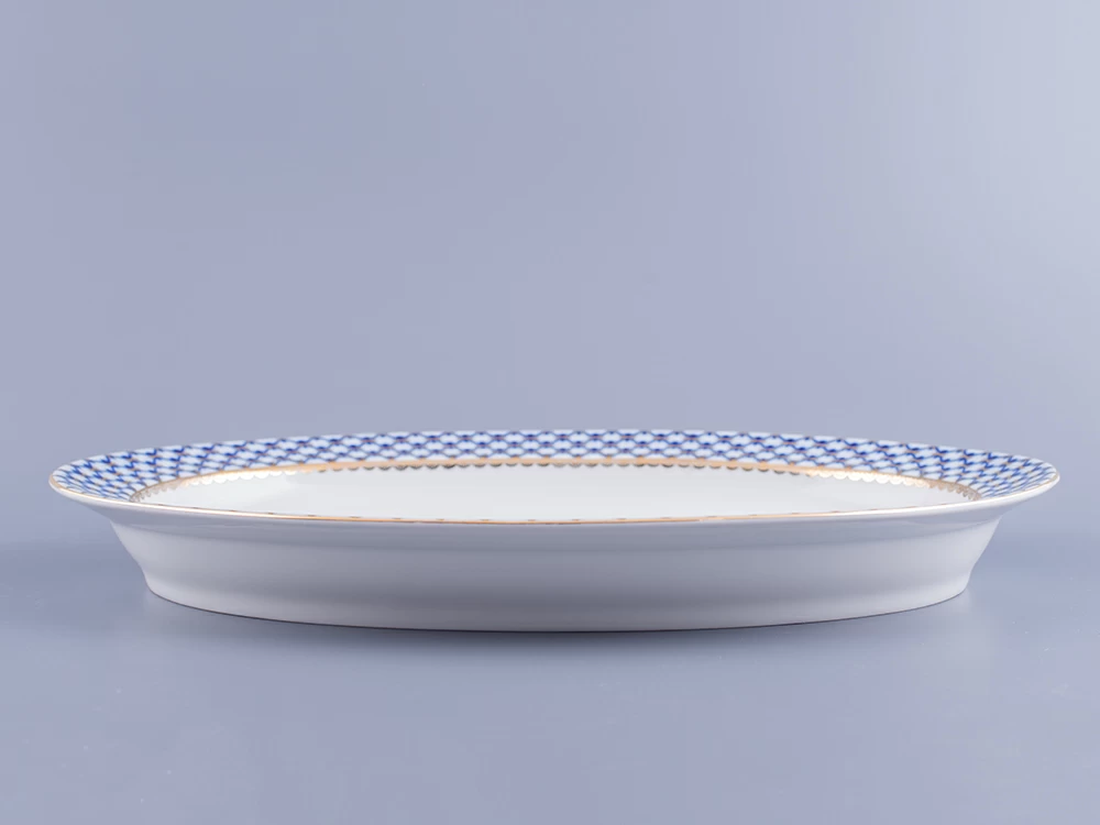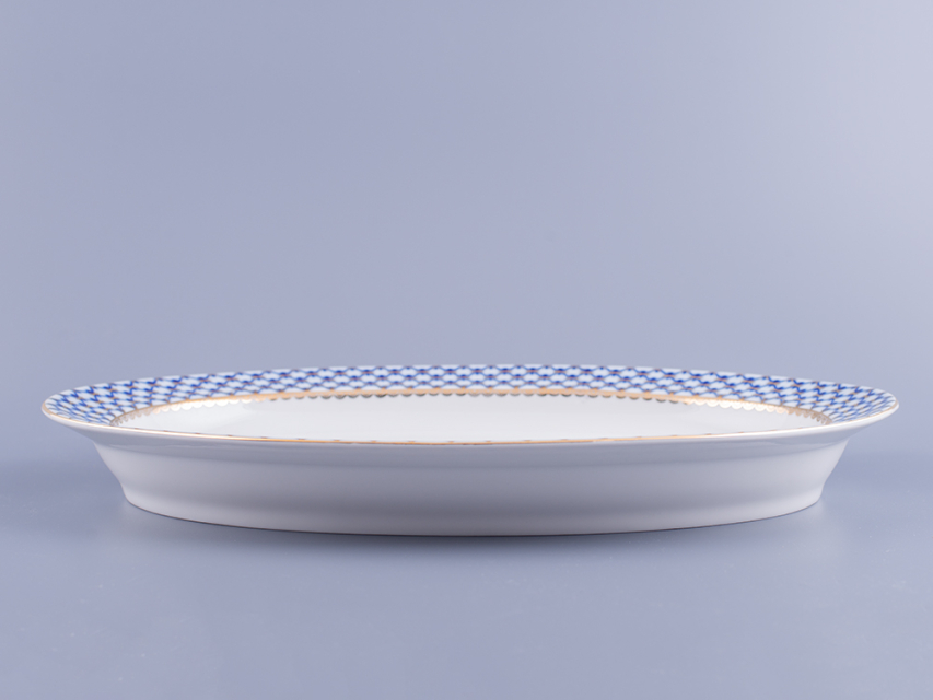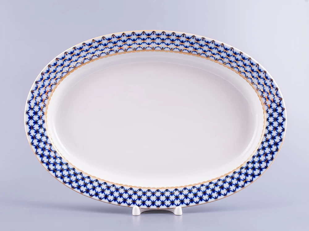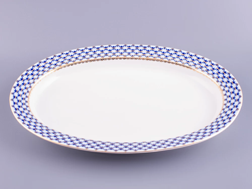 Блюдо овальное рис. Кобальтовая сетка изготовлено на Императорском фарфоровом заводе из твердого фарфора с элементами ручной росписи. Автор рисунка - Яцкевич А.А. Максимальная длина изделия - 350 мм.