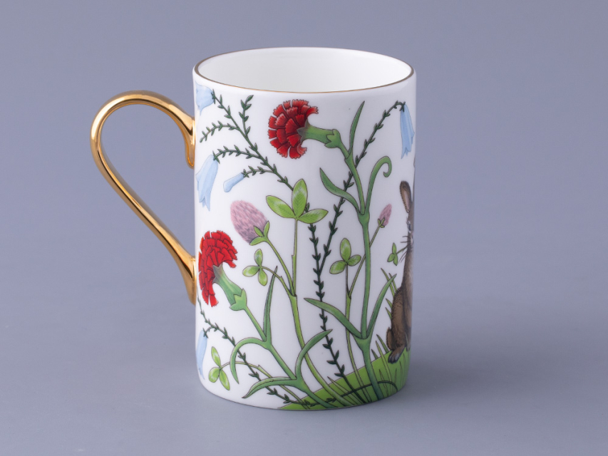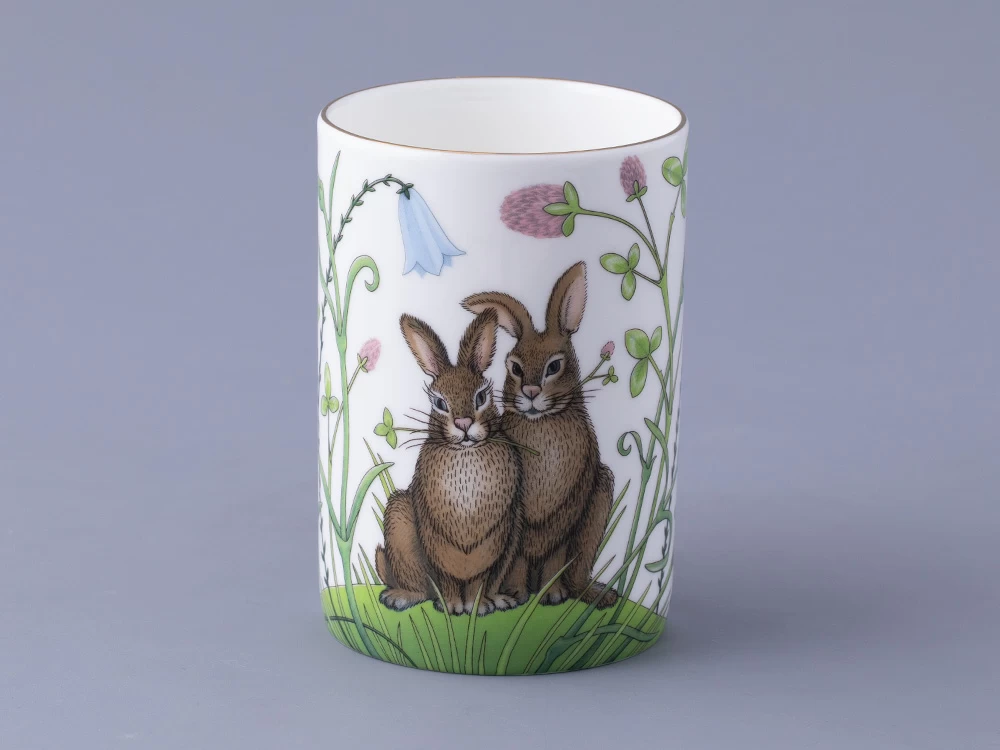 Центром композиции рисунка на бокале стала пара любопытных зайчиков, притаившихся в цветущем разнотравье.