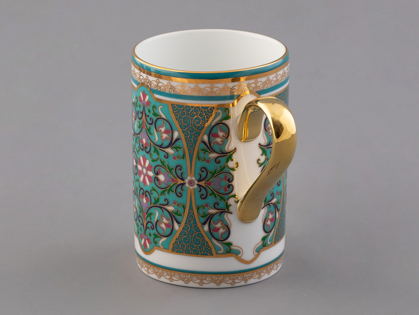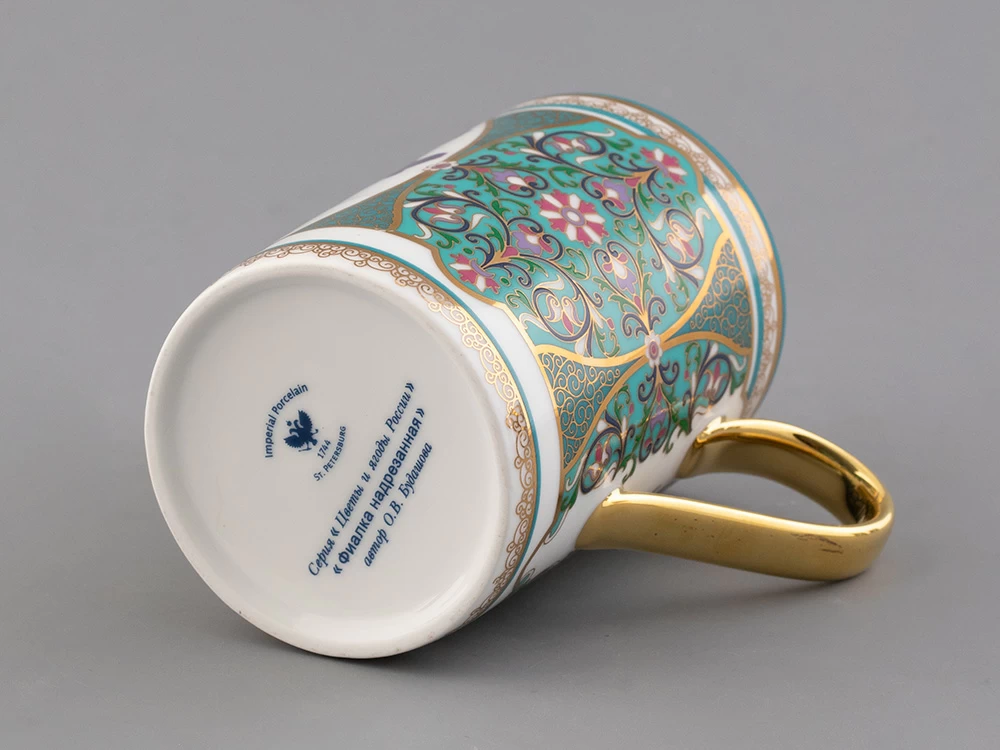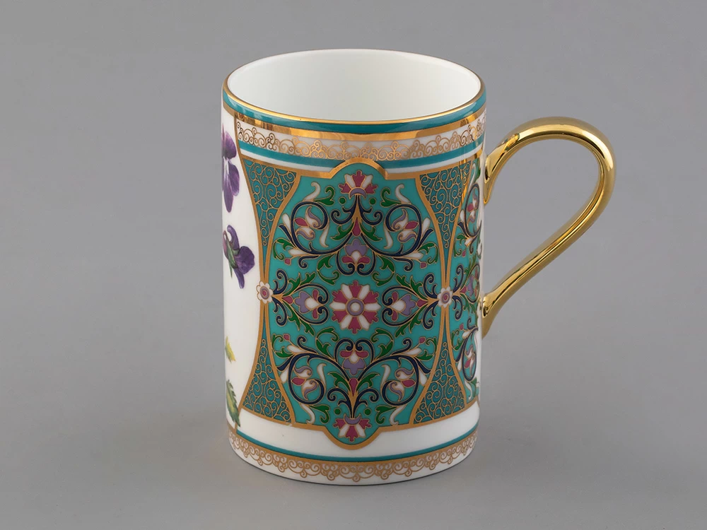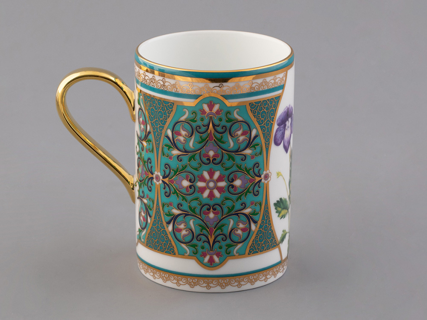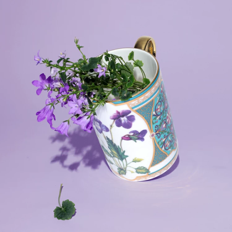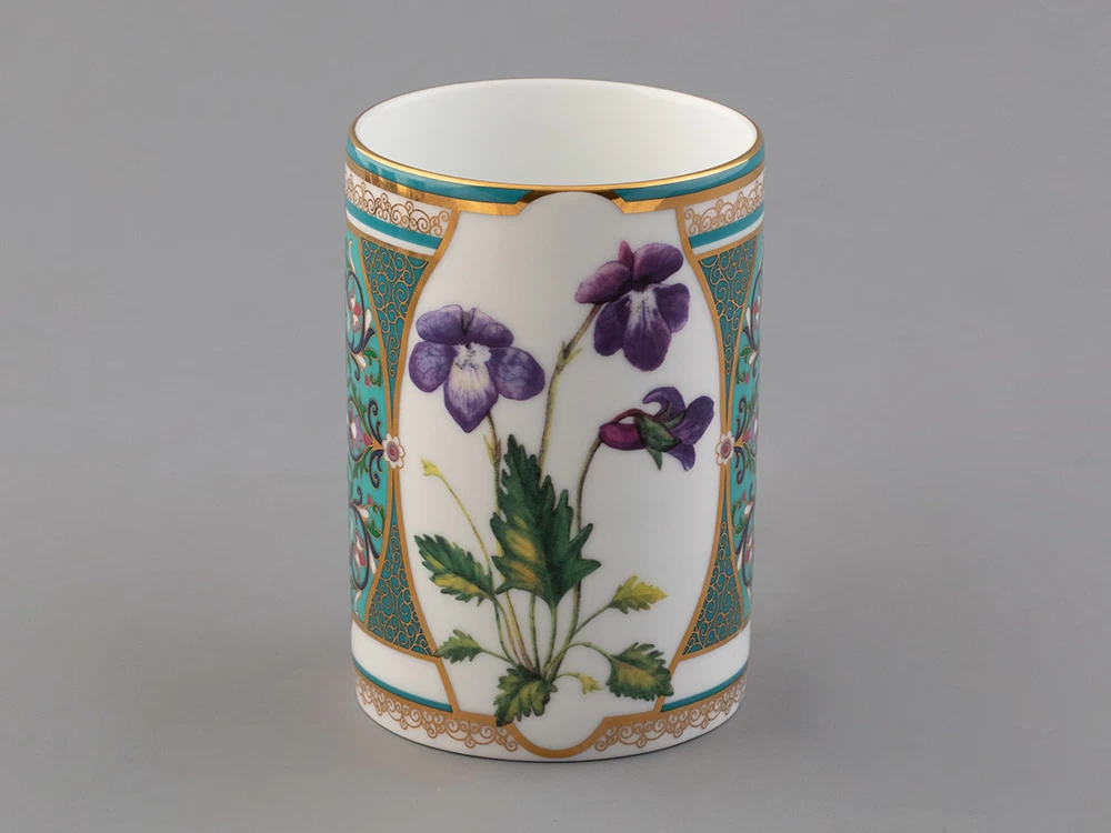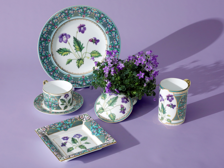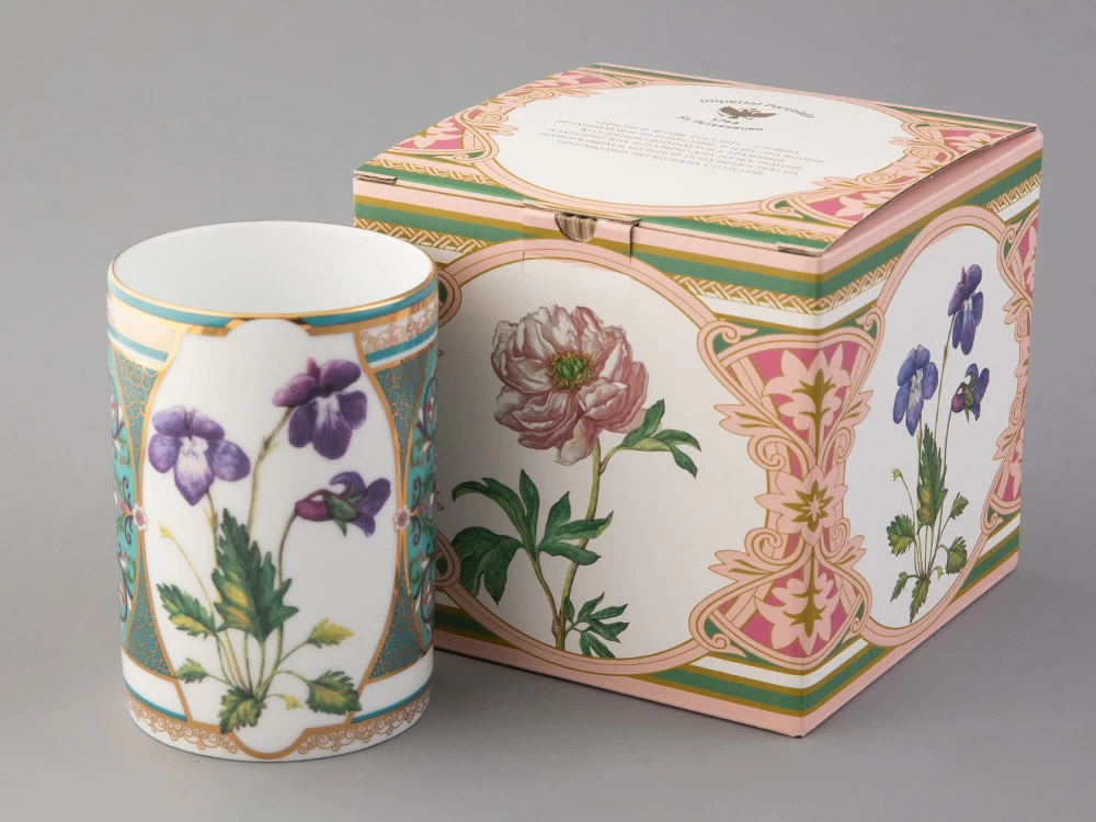 Бокал с фиалкой вошел в коллекцию «Цветы и ягоды России». Композиция на фарфоре, выполненная в эстетике винтажных ботанических иллюстраций, дополнена орнаментальным узором. Рисунок представляет собой авторское размышление на тему национальной вышивки.