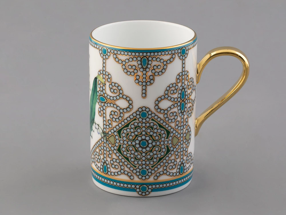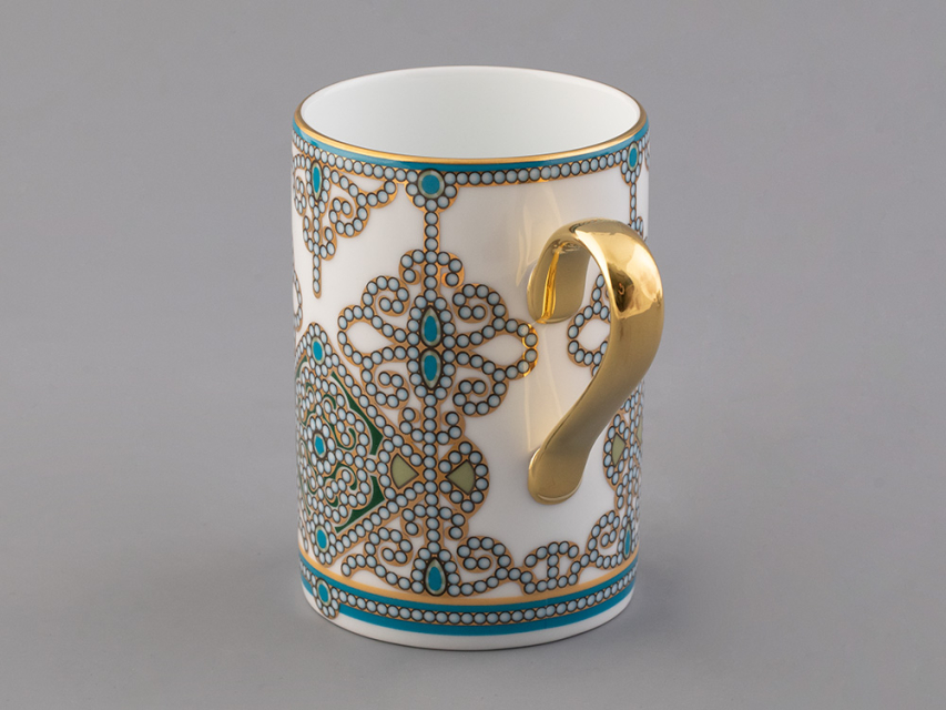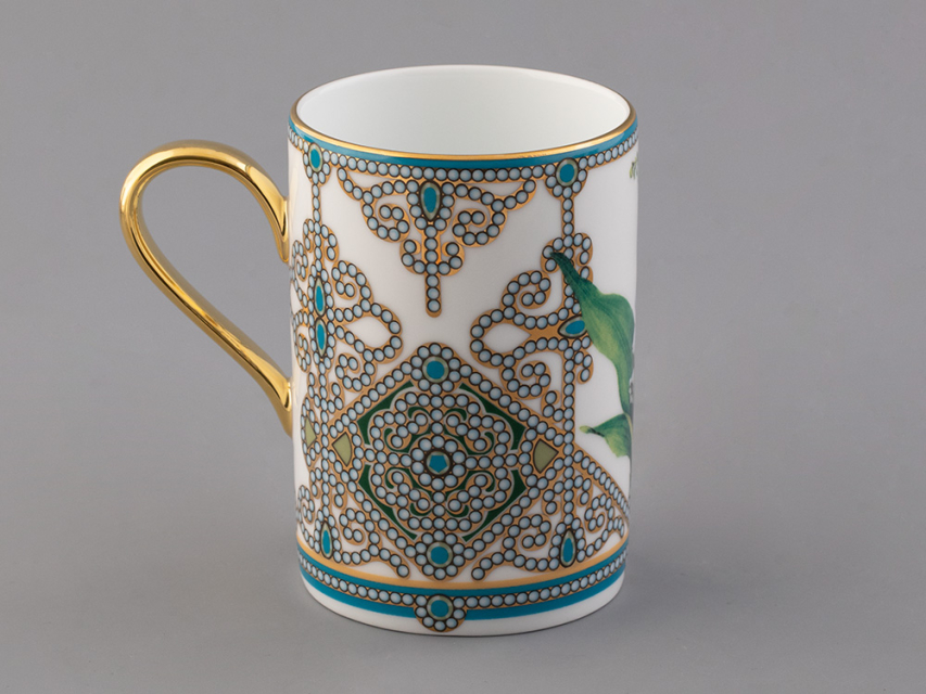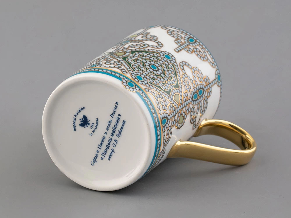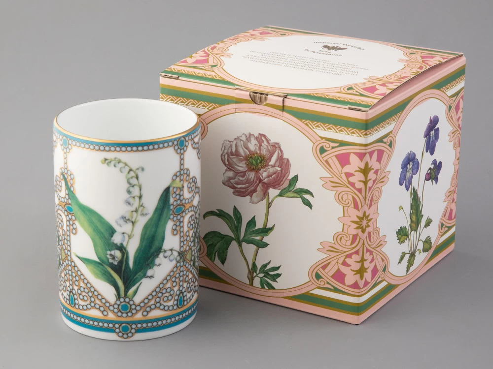 Бокал с майским ландышем вошел в коллекцию «Цветы и ягоды России». Композиция на фарфоре, выполненная в эстетике винтажных ботанических иллюстраций, дополнена орнаментальным узором. Рисунок представляет собой авторское размышление на тему национальной вышивки.
