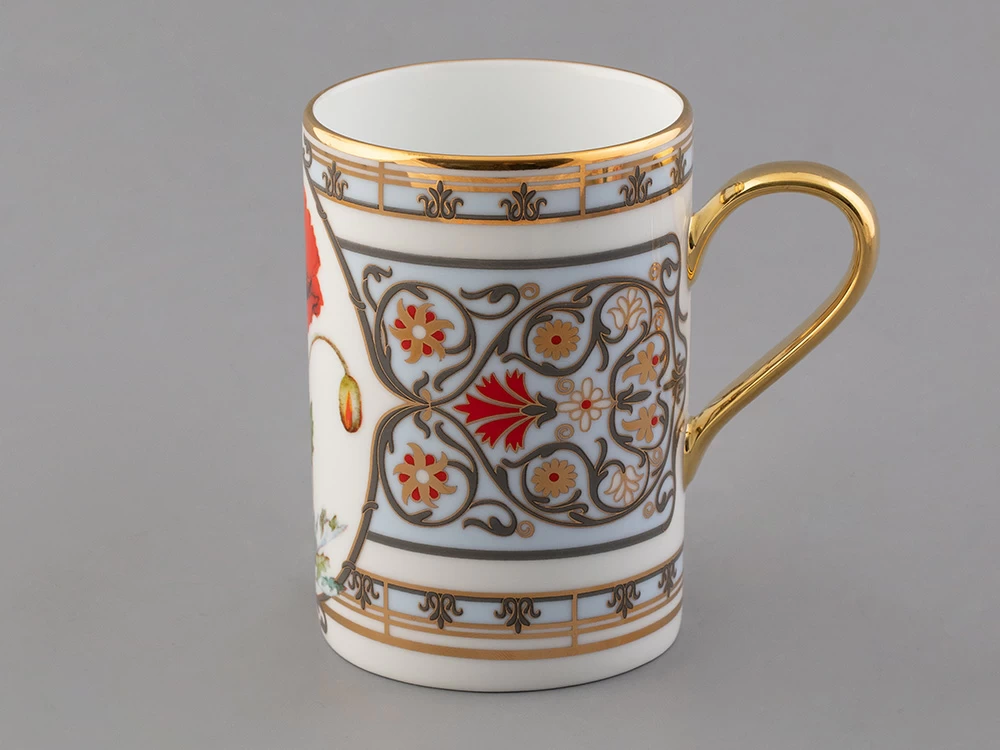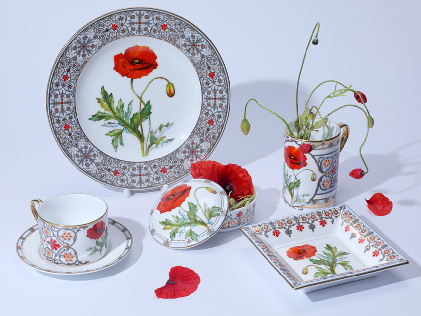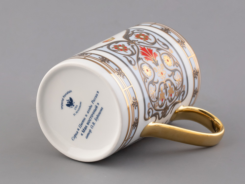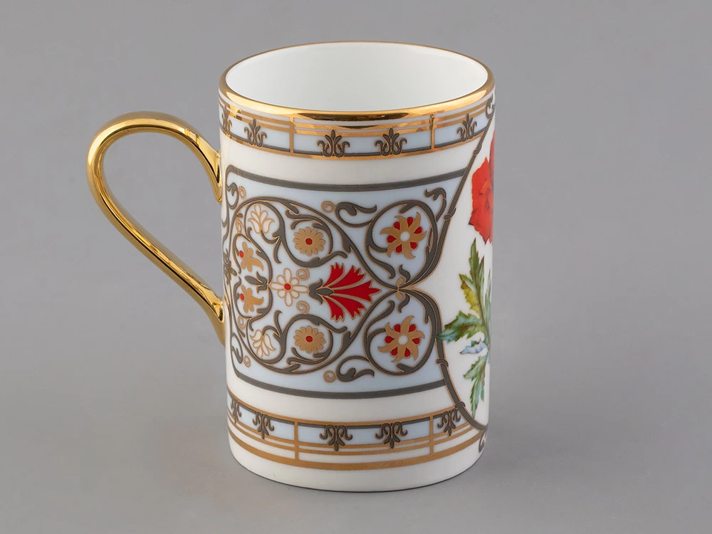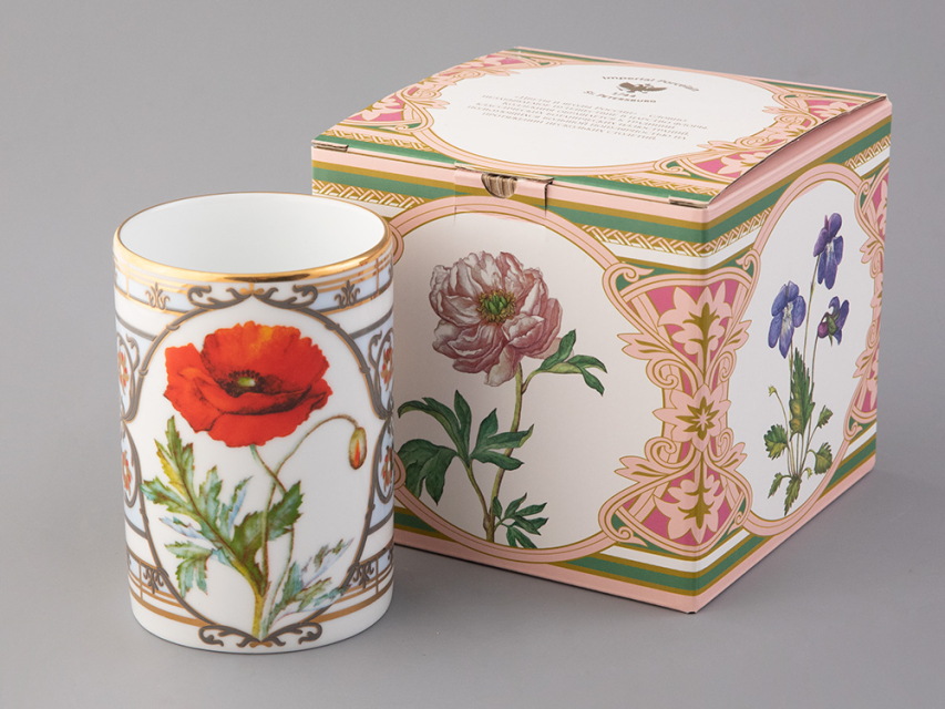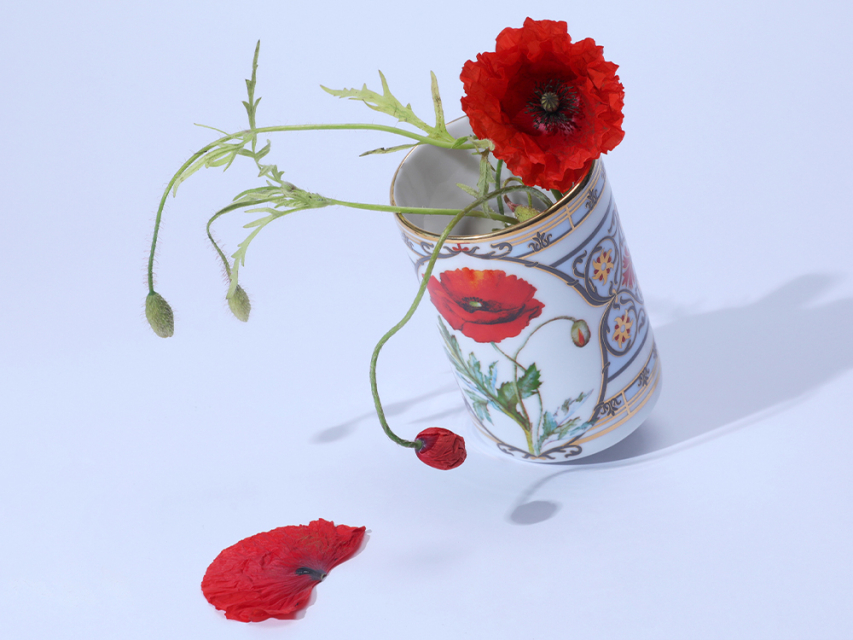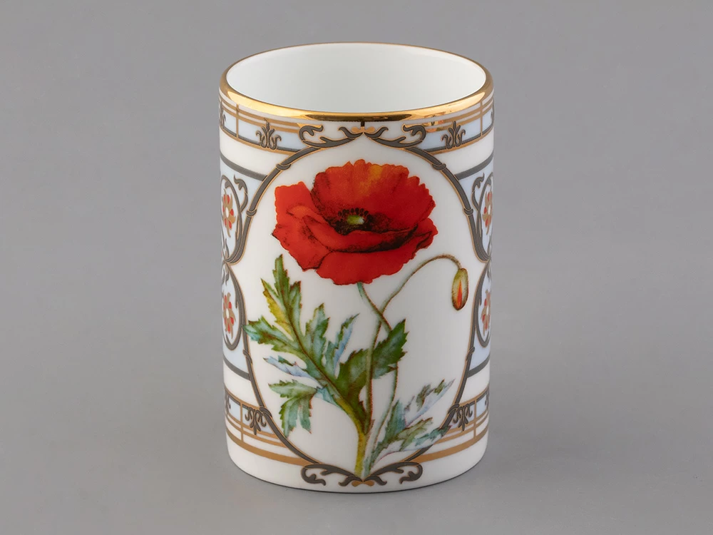 Бокал с маком восточным вошел в коллекцию «Цветы и ягоды России». Композиция на фарфоре, выполненная в эстетике винтажных ботанических иллюстраций, дополнена орнаментальным узором. Рисунок представляет собой авторское размышление на тему национальной вышивки.