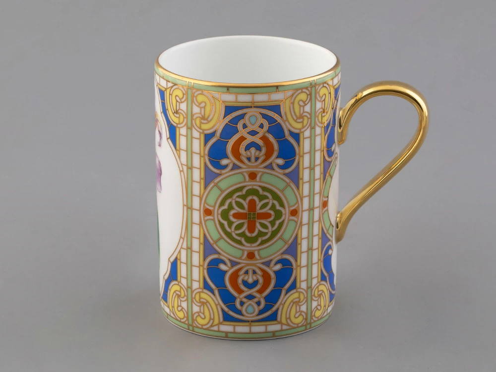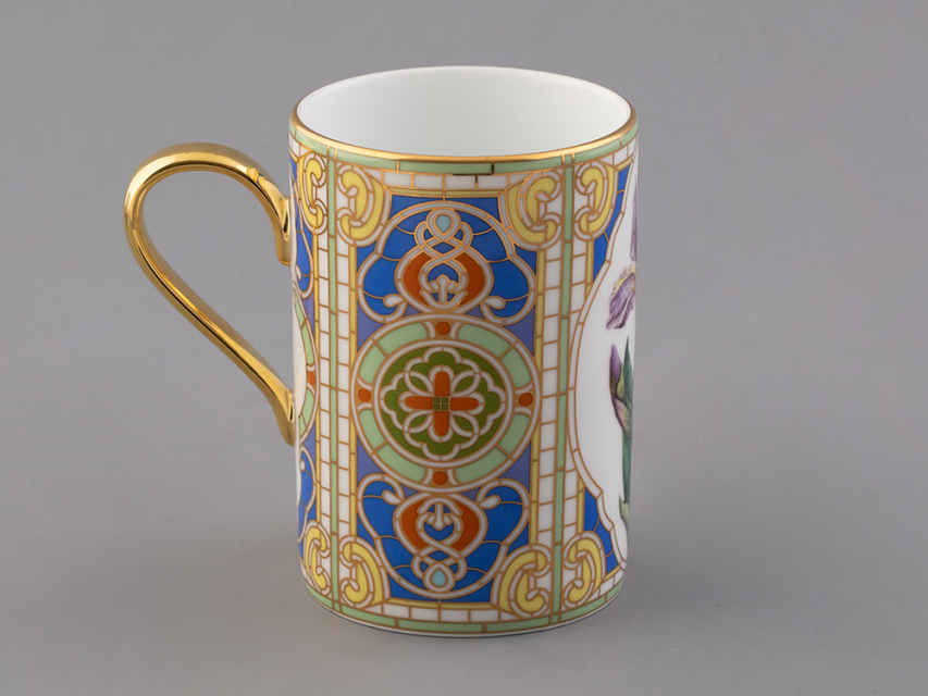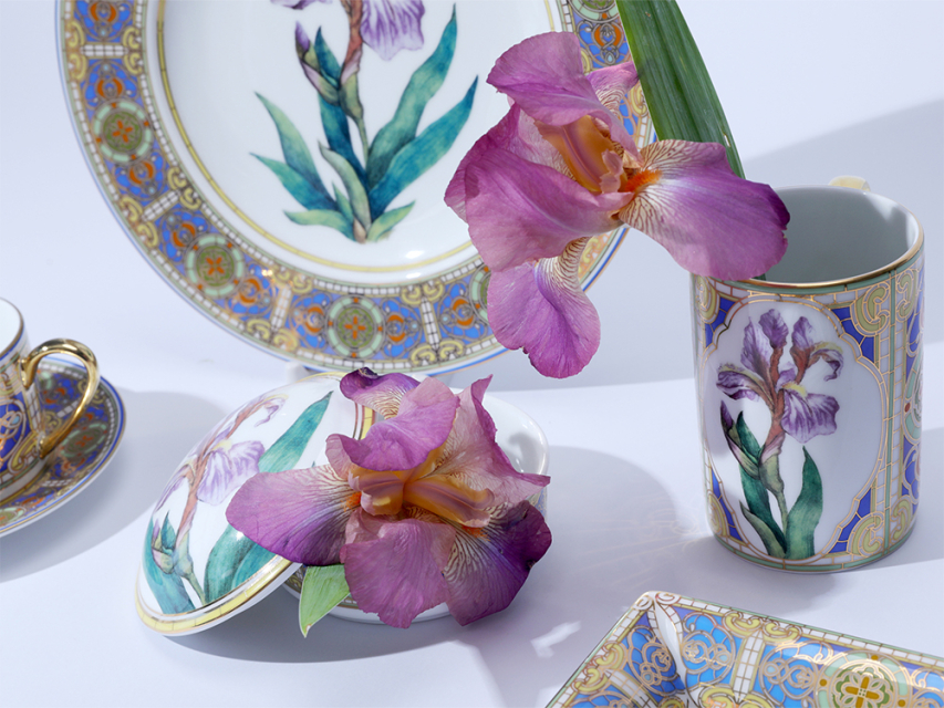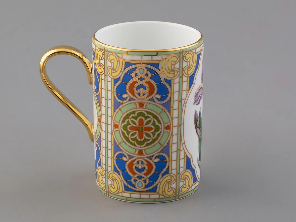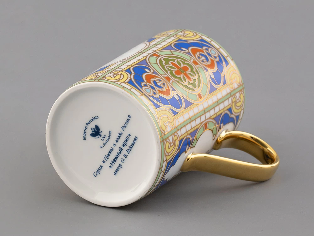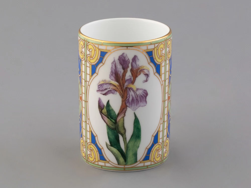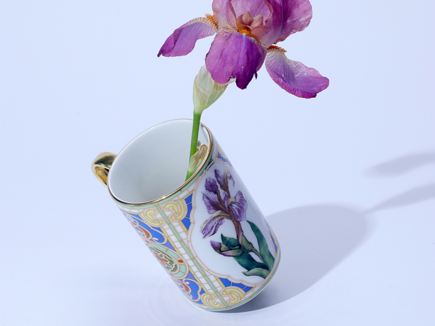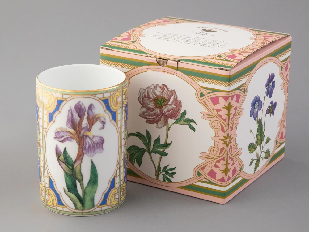 Бокал с нежным ирисом вошел в коллекцию «Цветы и ягоды России». Композиция на фарфоре, выполненная в эстетике винтажных ботанических иллюстраций, дополнена орнаментальным узором. Рисунок представляет собой авторское размышление на тему национальной вышивки.