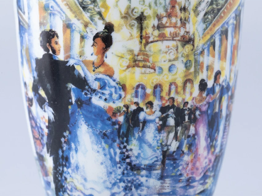 Бокал «Бал пушкинских героев» вошел в линейку фарфора из совместного проекта Императорского фарфорового завода и художника Миши Ленна. В этот раз художник решил обратиться к своей излюбленной теме – танцу, воплощенному через узнаваемых всеми персонажей. Александр Пушкин и Наталья Гончарова, погруженные в танец, олицетворяют романтику и страсть, которые пронизывают творчество поэта. Также в этот вечер среди танцующих пар можно увидеть образы персонажей из произведений Пушкина, которые словно оживают, добавляя волшебства в этот бал.