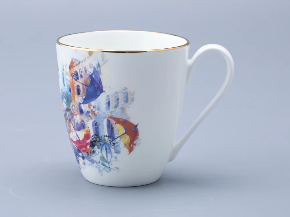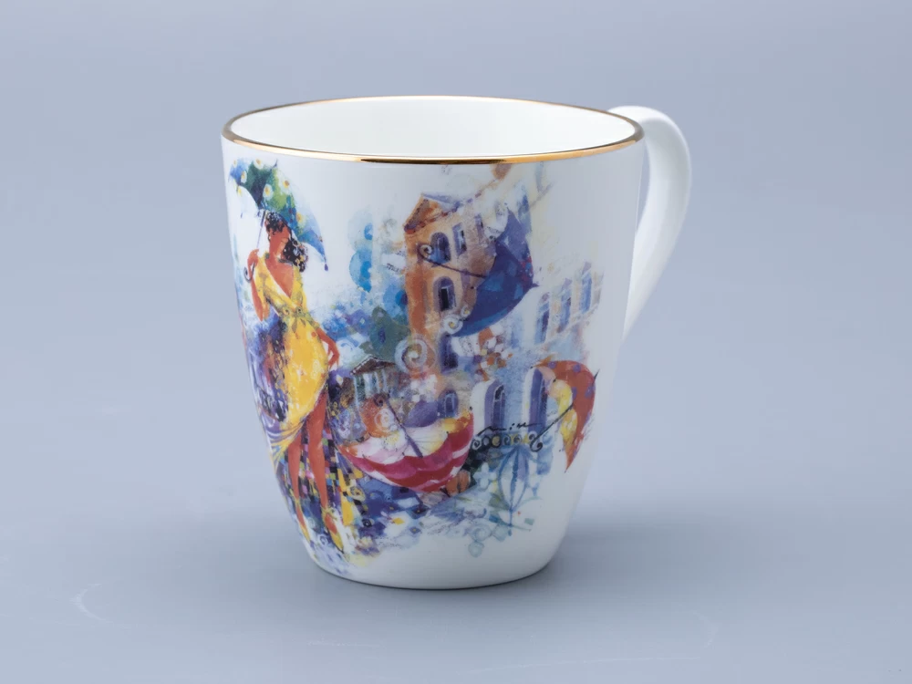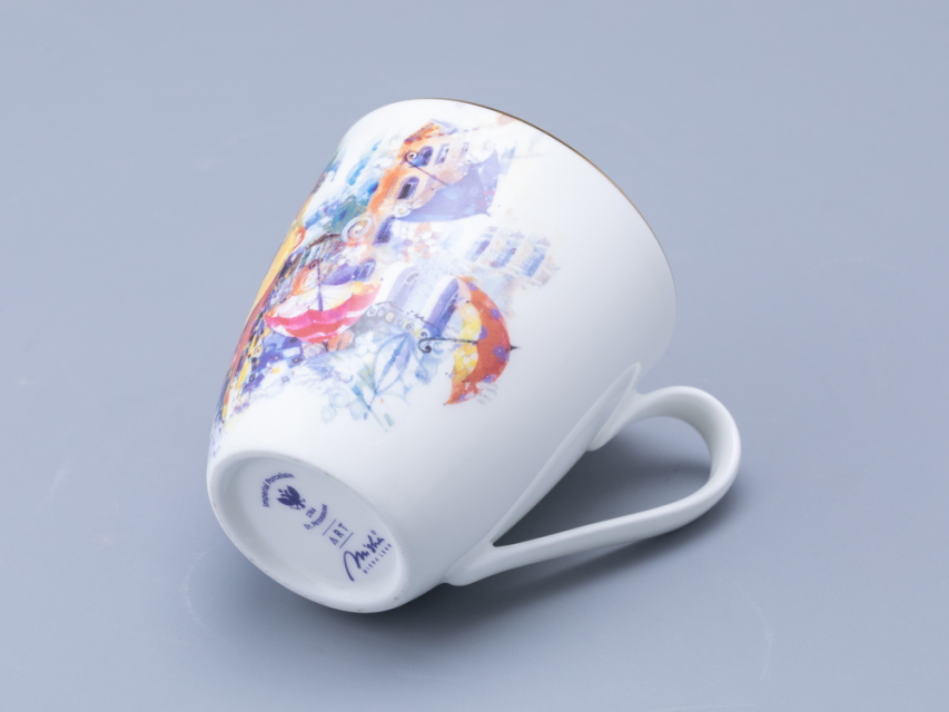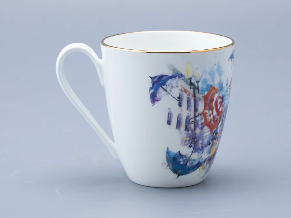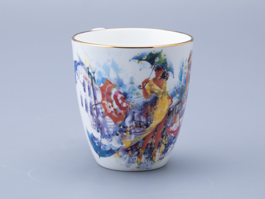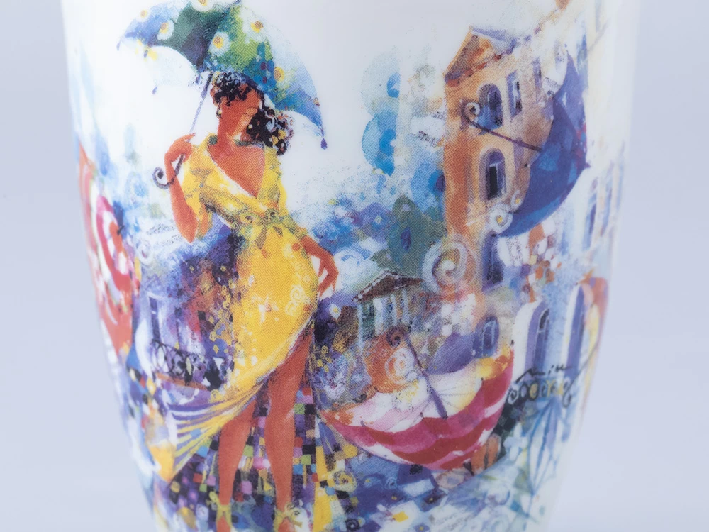 Бокал «Летающие зонтики» вошел в линейку фарфора из совместного проекта Императорского фарфорового завода и художника Миши Ленна. В своем рисунке автор вновь обращается к теме женской красоты и грации. Художник изображает девушку в желтом платье, окруженную летающими зонтиками. Эта девушка выглядит как настоящая фея, которая привнесла в город каплю волшебства. Она не просто красива, она – символ надежды и мечты, который напоминает всем, что жизнь полна ярких моментов и неожиданных поворотов. Каждый зонт, парящий в воздухе, словно говорит о том, что даже в самой обыденной жизни можно найти место для магии и чудес. Бокал доступен в двух вариантах исполнения: с золотой отводкой и без. Данный вариант украшен золотой отводкой. |
