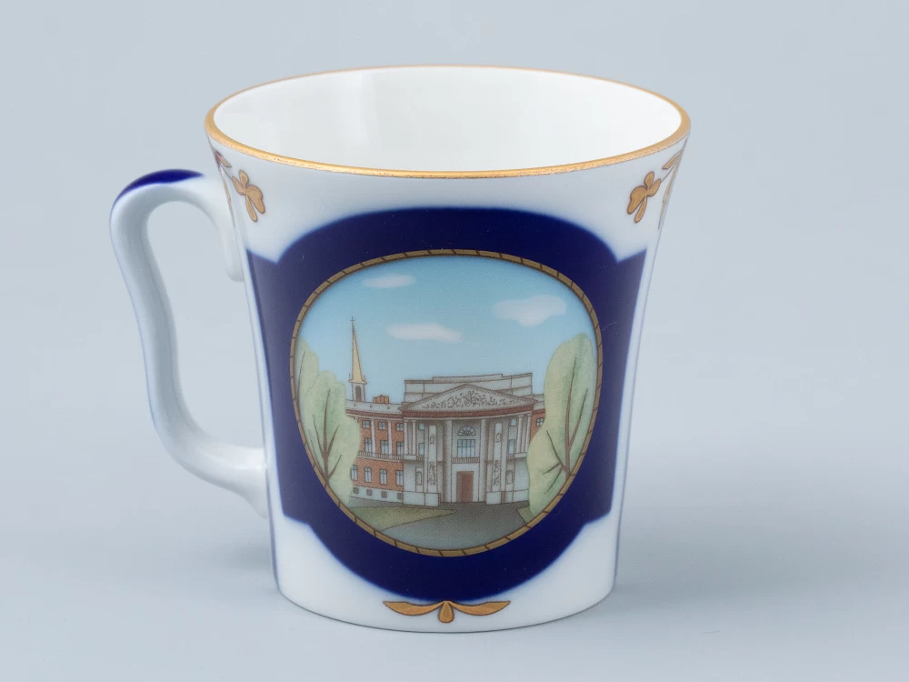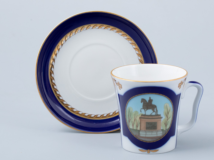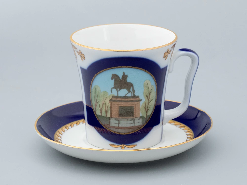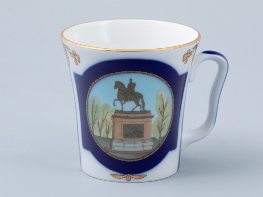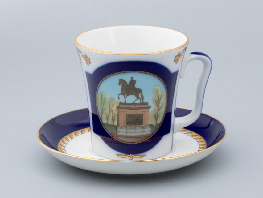 Бокал с блюдцем «Прадеду правнук» вошел в серию фарфора, созданную Заслуженным художником РФ Татьяной Афанасьевой к 320-летию Санкт-Петербурга. На бокале изображен бронзовый памятник Петру I, установленный перед Михайловским замком. «Прадеду правнук» – надпись на постаменте этого монумента, выполненная по повелению императора Павла I. В декоре автор намеренно использует активный кобальт и вписывает достопримечательность в золотое обрамление, проводя параллель с выдающейся коллекцией «Классика Петербурга» Галины Шуляк.