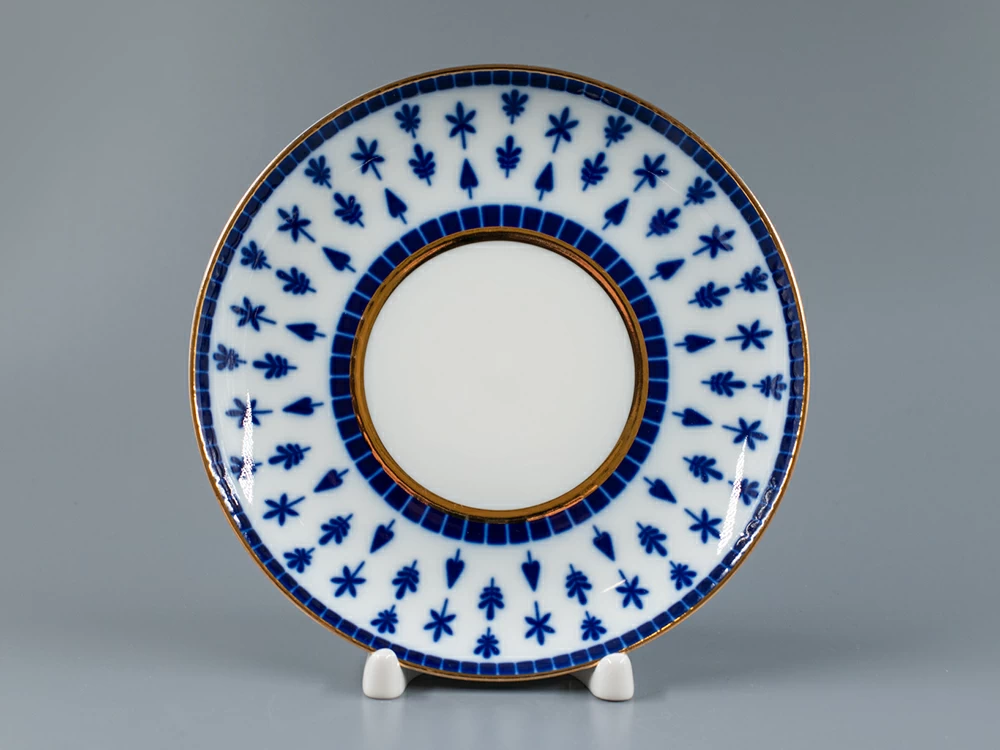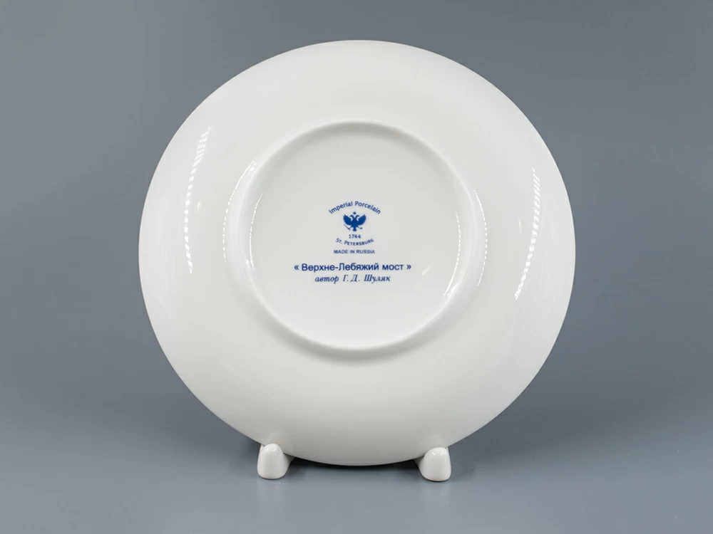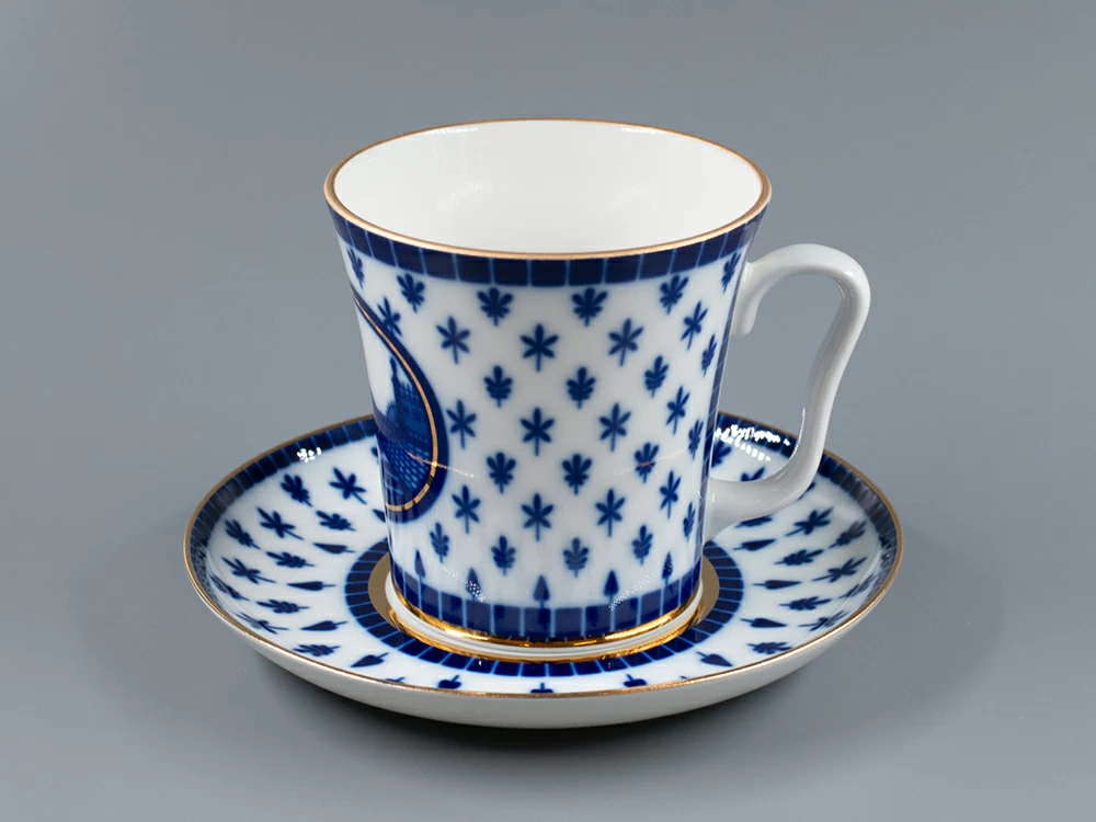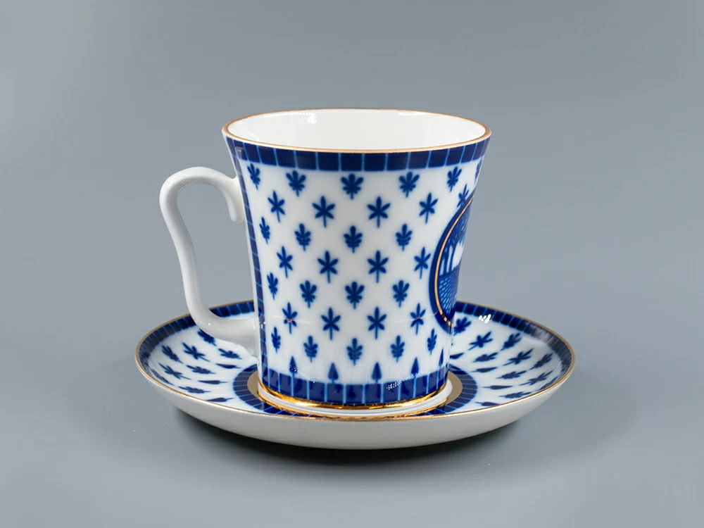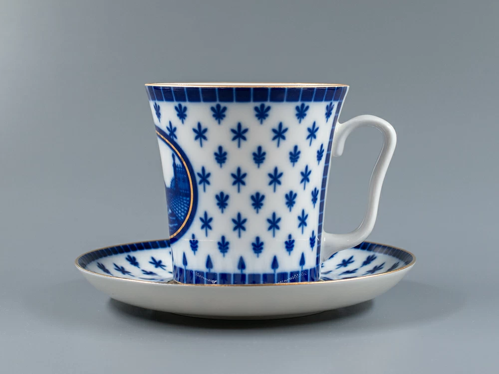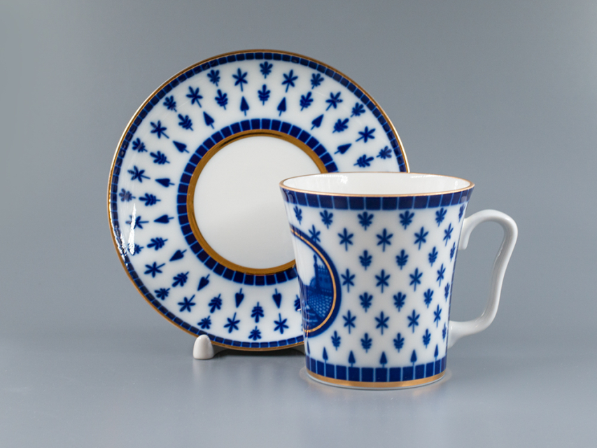 Бокал с блюдцем изготовлен на Императорском фарфоровом заводе из твердого фарфора. Для декорирования используется подглазурная деколь, отводка золотом. Автор рисунка - Галина Шуляк, автор формы - Эдуард Криммер.