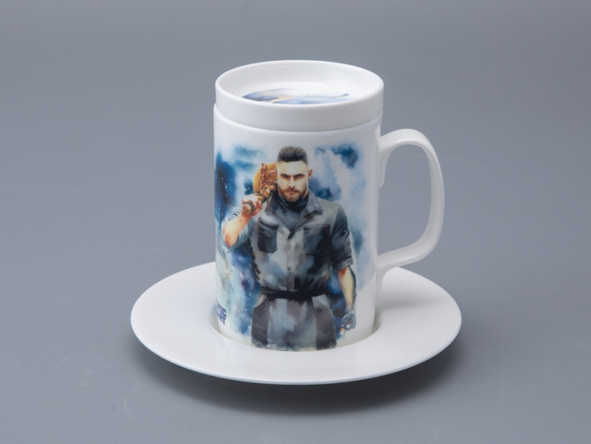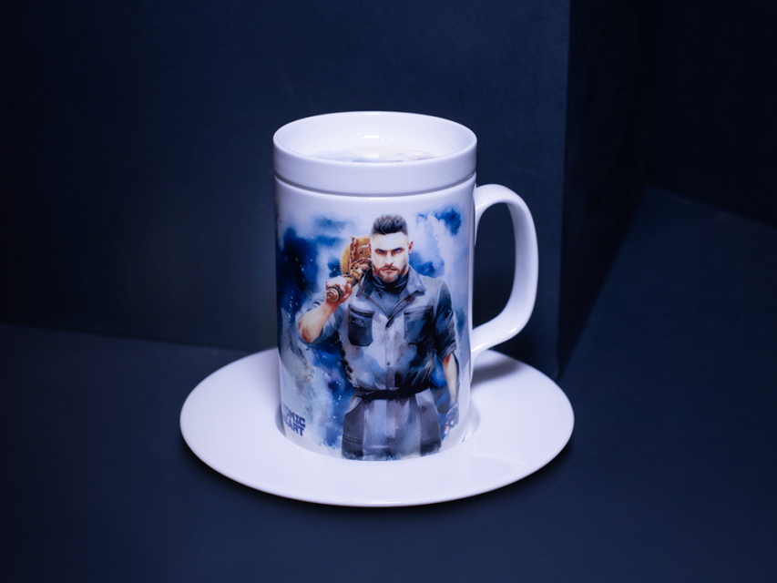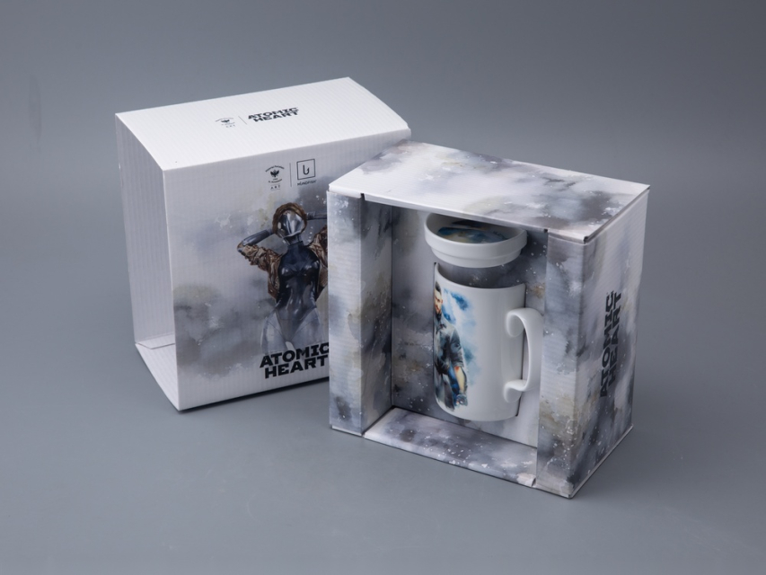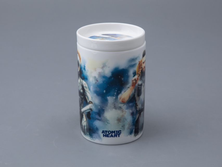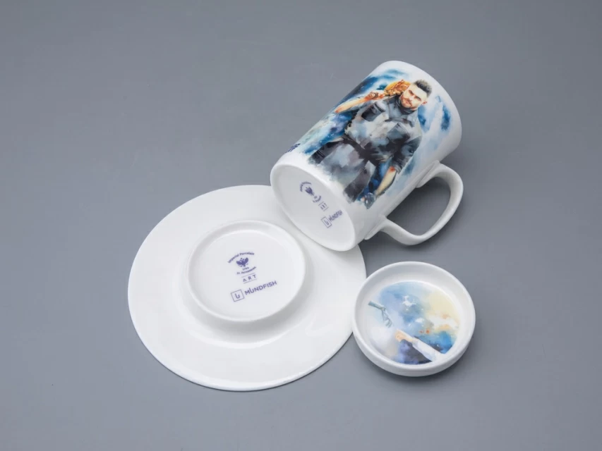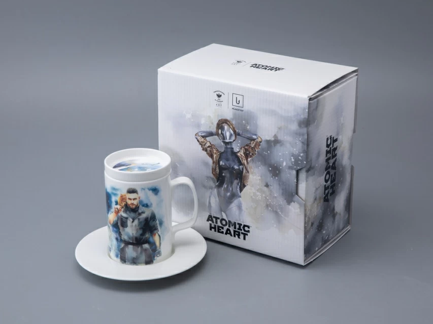 На бокале изображены главный агент советской разведки Сергей Нечаев с молотом на плече и загадочная Левая Близняшка с волосами, заплетенными в венок, и красной звездой на лбу. Блюдце также украшено изображением Близняшки. Чайная пара дополнена крышкой, на которой протянутые друг к другу руки человека и робота символизируют взаимодействие между человечеством и передовыми технологиями, а также идею сотрудничества и совместного развития в альтернативном Советском Союзе, где роботы стали частью повседневной жизни.