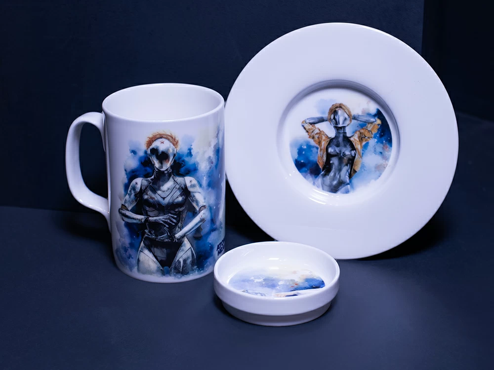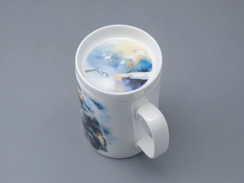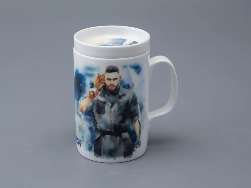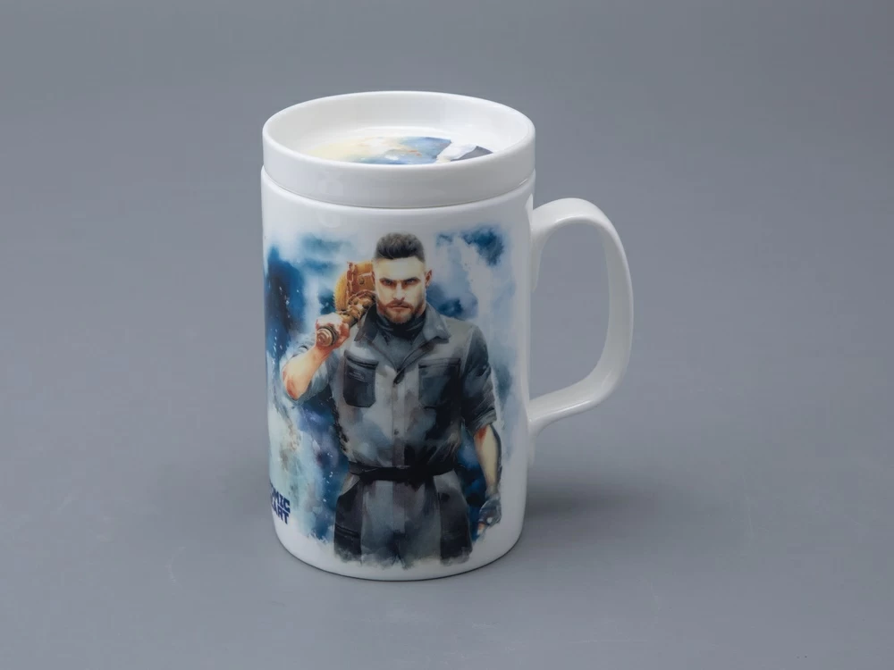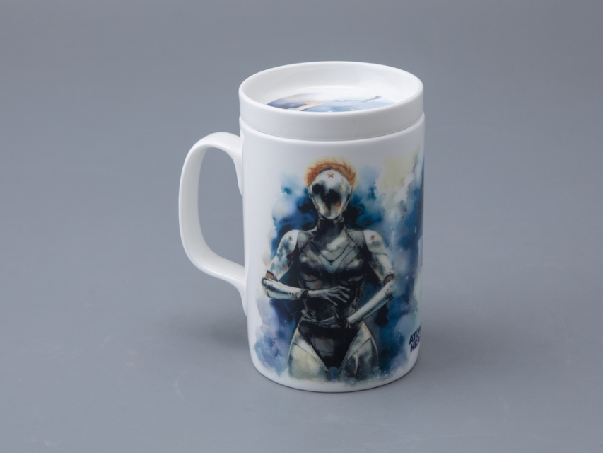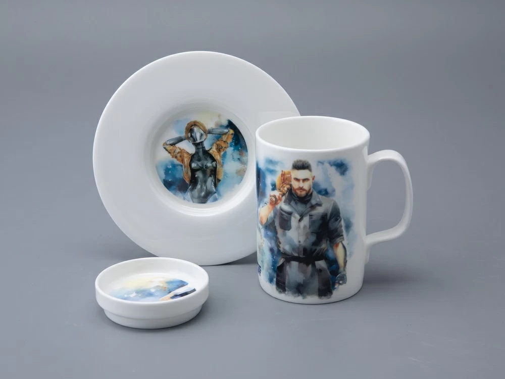 На бокале изображены главный агент советской разведки Сергей Нечаев с молотом на плече и загадочная Левая Близняшка с волосами, заплетенными в венок, и красной звездой на лбу. Блюдце также украшено изображением Близняшки. Чайная пара дополнена крышкой, на которой протянутые друг к другу руки человека и робота символизируют взаимодействие между человечеством и передовыми технологиями, а также идею сотрудничества и совместного развития в альтернативном Советском Союзе, где роботы стали частью повседневной жизни.