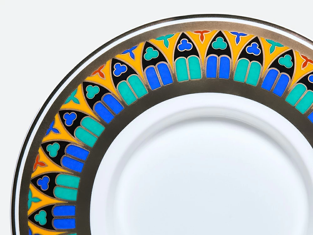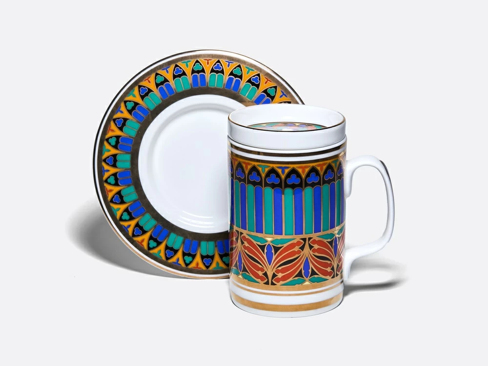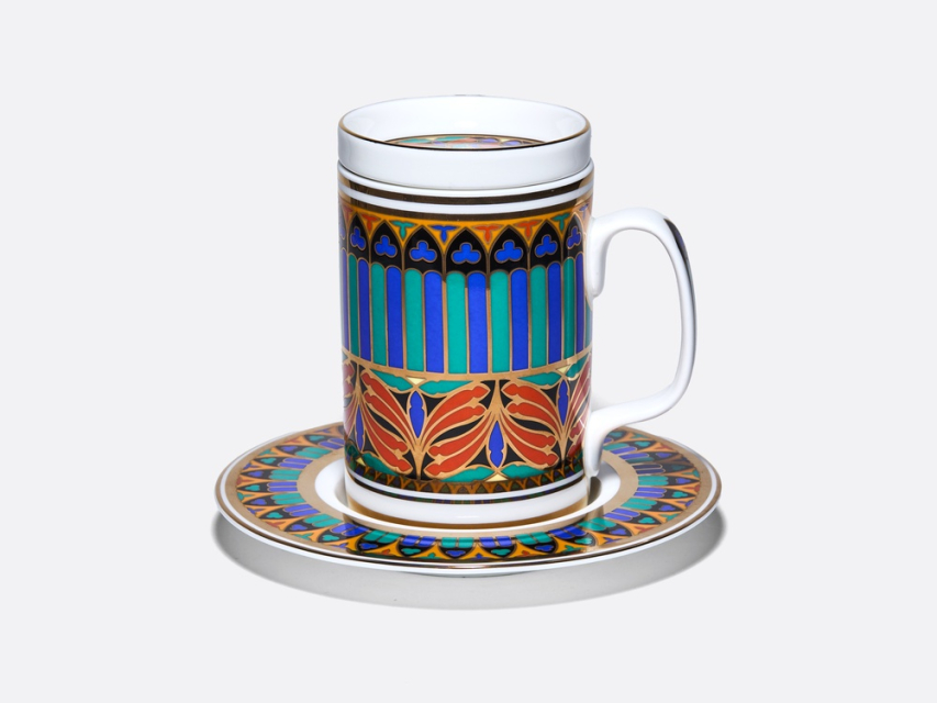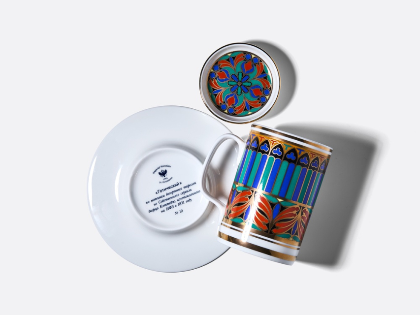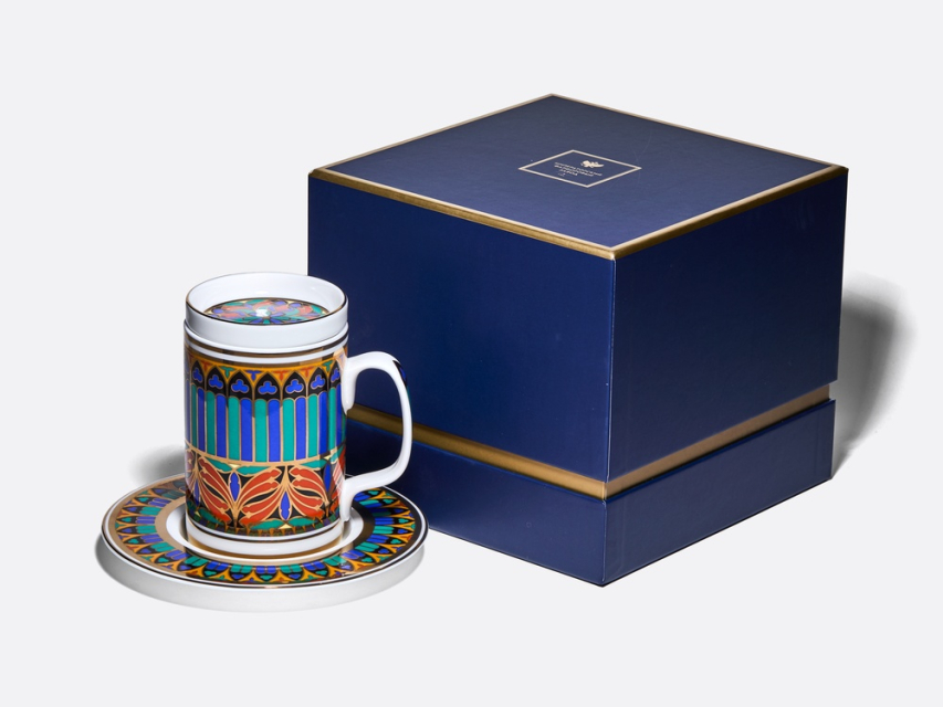 Роскошный орнамент бокала – дань уважения богатому наследию Императорского фарфорового завода и продолжение славной истории русского фарфора. В нем с первого взгляда узнаются мотивы знаменитого сервиза "Готический" и серии "Готических" тарелок первой половины XIX века. Круговая композиция, украшающая бокал и блюдце, воссоздает магию витражей и напоминает стрельчатые окна готических соборов. Рисунок на крышке продолжает тему, повторяя мотив витражной «розы», характерного элемента готических храмов. Цветовая палитра рисунка включает насыщенные оттенки красного, синего, зеленого и черного цветов, традиционно ассоциирующихся с готикой. Сочетание с белоснежным костяным фарфором и золотыми вставками создает контраст и ощущение игры света сквозь витражи древних храмов. Роскошный бокал с блюдцем и крышкой непременно привлечет внимание и станет эффектной деталью на вашем столе. Поставляется в подарочной упаковке, что делает ее прекрасным подарком для ценителей прекрасного. |