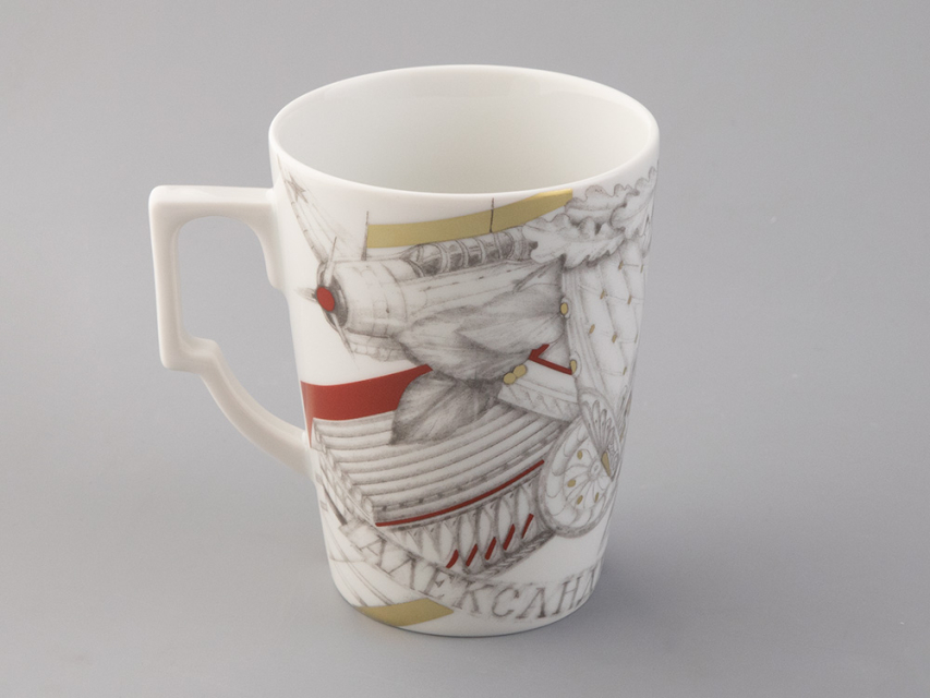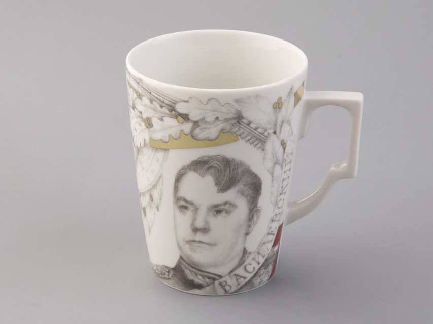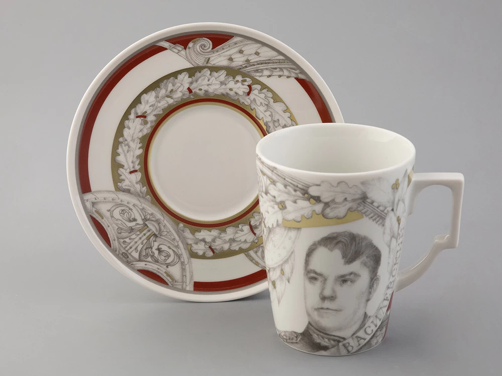 Портрет Константина Константиновича Рокоссовского, выполненный по историческим фотографиям с мастерством и тщательностью, олицетворяет силу духа и военную гениальность одного из выдающихся полководцев Великой Отечественной войны. Композицию на фарфоре художник дополняет элементами трофейного декора, авиатехники и гусениц танков, дубовыми и лавровыми венками. Графика напоминает о традициях русского ампира, который прославляет величие и могущество нашей страны.