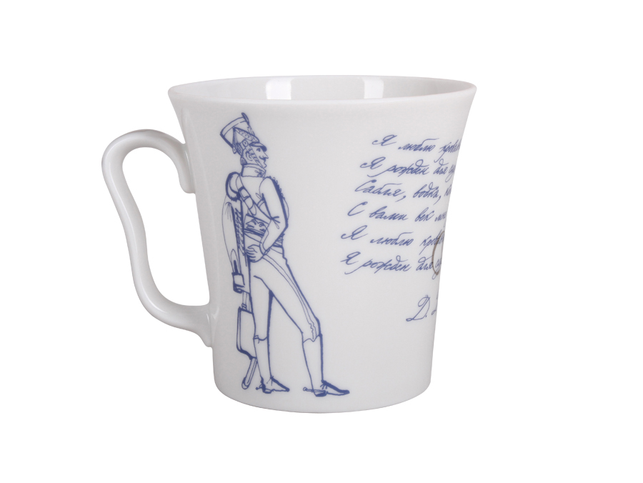 На предметах сервиза изображены персонажи и представлены цитаты из произведений о «питомцах славы». Хаотичные, слегка приглушенные росписи создают ощущение динамики, и кажется, что сюжеты, строки, вензеля, атрибуты воинской доблести сплетаются витиеватой вязью в единое целое и на фарфоре, и в воображении художника.