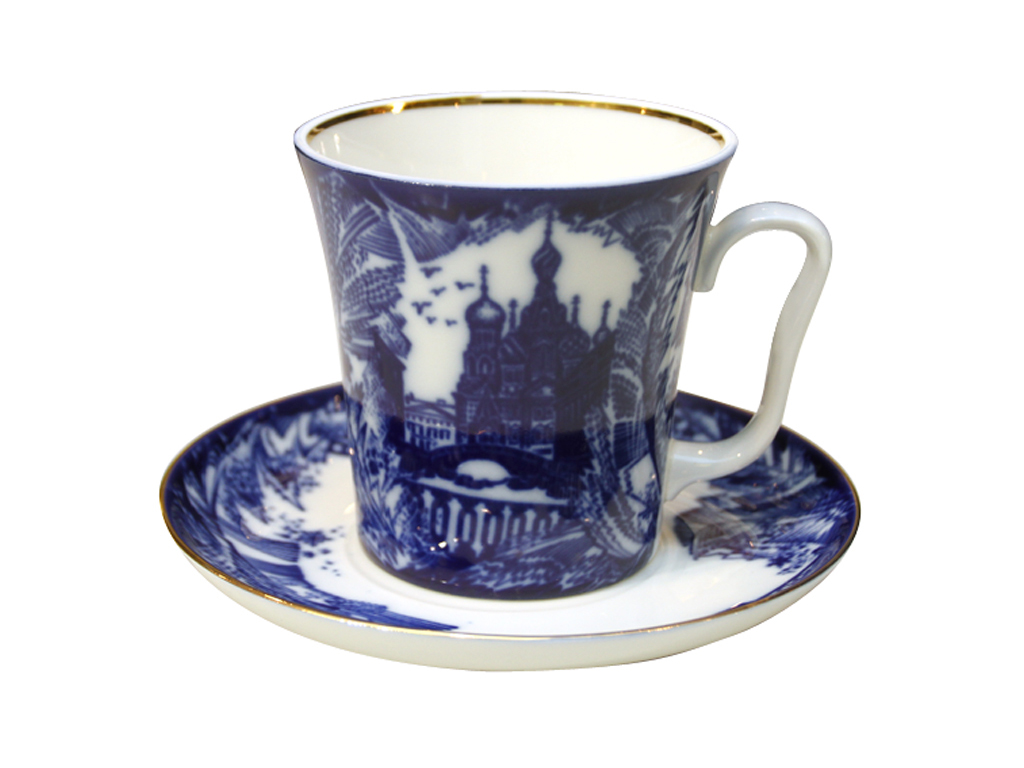 Бокал с блюдцем изготовлен на Императорском фарфоровом заводе из твердого фарфора. Для декорирования используется подглазурная деколь, отводка золотом. Автор рисунка - Ольга Матвеева, автор формы - Эдуард Криммер.
