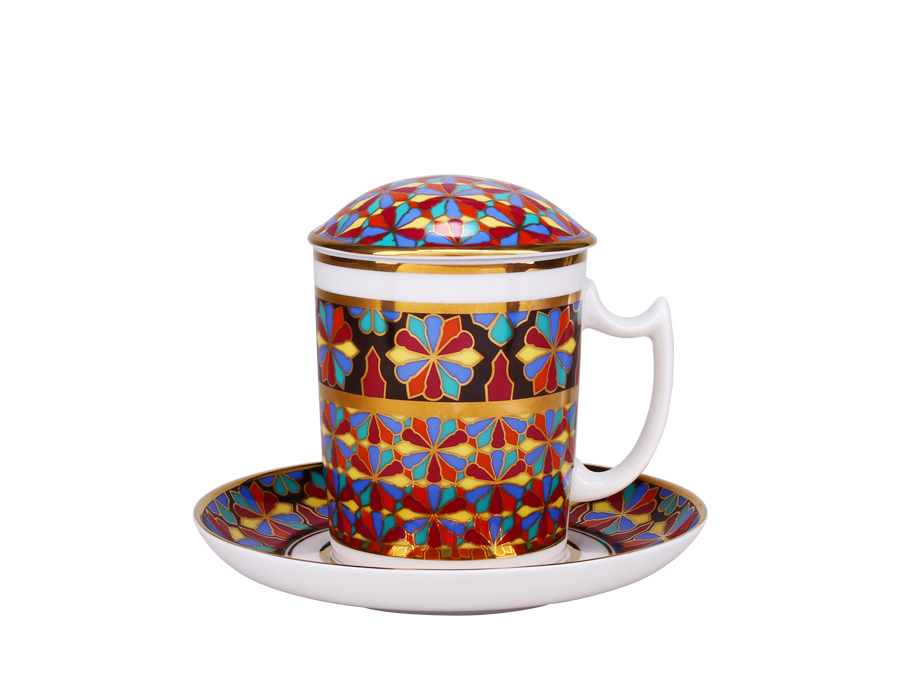Изысканный геометрический узор удивительных по красоте средневековых витражей с главенствующими яркими, живыми цветами готического стиля – пурпурным, бордо, алым, золотым, изумрудным, кобальтовым, фиолетовым и иссиня-черным деликатно перенесен на бокалы и блюдца, которые отличаются редким стилистическим единством и утонченностью.