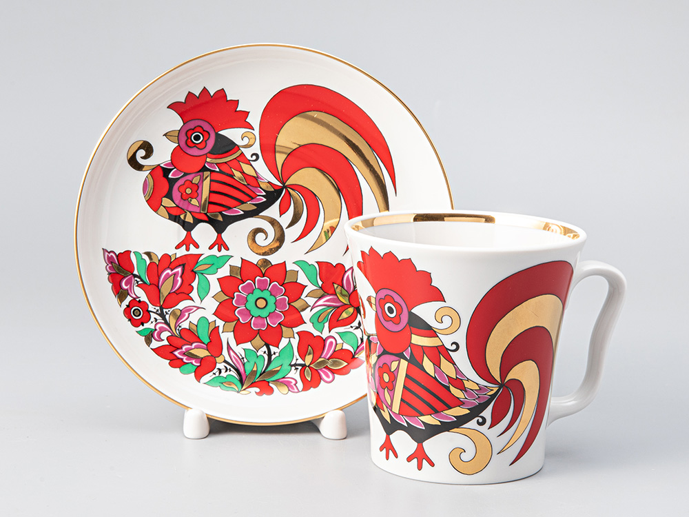 С 2-х сторон тулова бокала и на блюдце изображение сказочного петуха с распущенным хвостом и растительный узор. Кистью вручную нанесена отводка золотосодержащим препаратом по краю блюдца и внутреннему краю бокала.