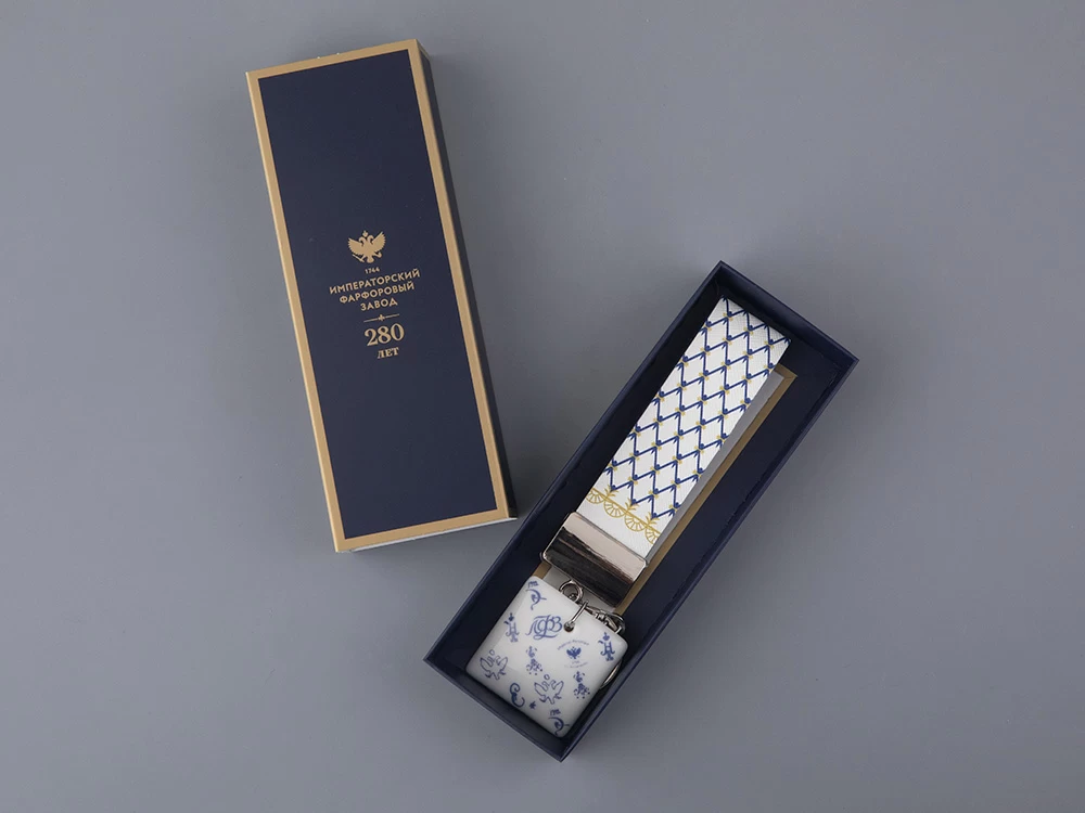 Брелок вошел в линейку фарфора «Лого». Он декорирован изображениями марок и знаков, которые ставились на предметы, изготовленные на ИФЗ с начала действия производства в середине XVIII века до наших дней. Помимо брелоков в серию вошли чайные пары с заводскими марками разных лет.