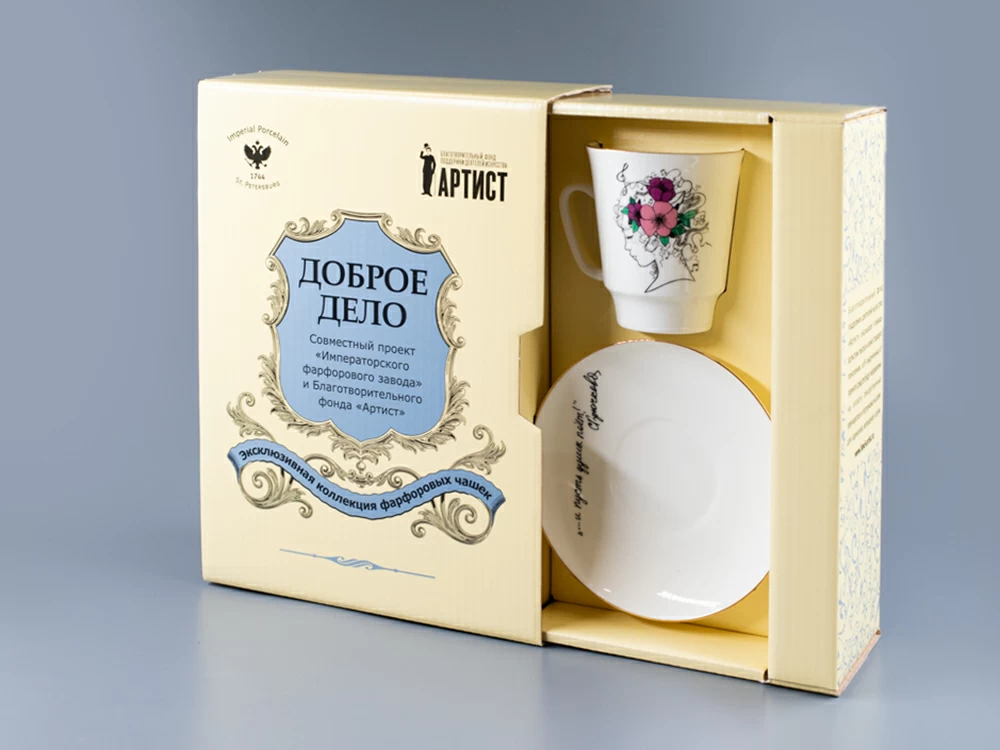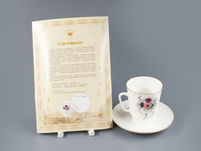 На белой поверхности костяного фарфора – изящный профиль девушки, локоны которой сплетены из мелодий и украшены цветами. Это образ души, находящейся в гармонии с миром. Совершайте добрые дела «…и пусть душа поёт!» - напоминает актриса Светлана Крючкова. В начале 2015 года стартовал совместный благотворительный проект Императорского фарфорового завода и фонда «Артист». При участии выдающихся деятелей культуры и искусства будет создана эксклюзивная коллекция фарфоровых сувениров, все средства от продажи которой будут направлены на оказание поддержки деятелям искусств старшего поколения. Светлана Николаевна Крючкова - актриса театра и кино, режиссёр, мастер художественного слова. Народная артистка России (1993). Дважды лауреат премии «Ника».