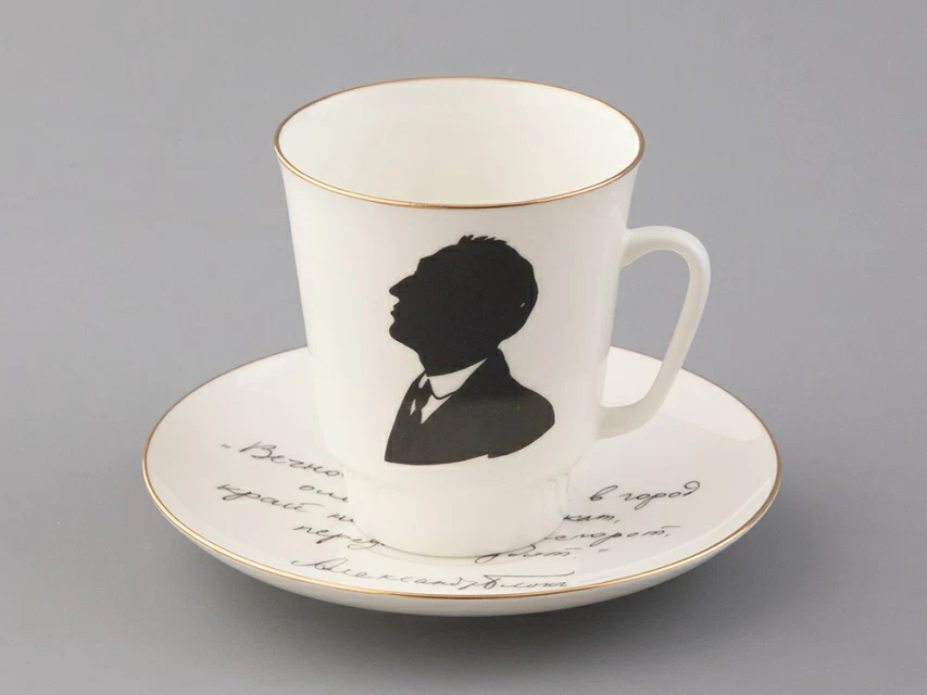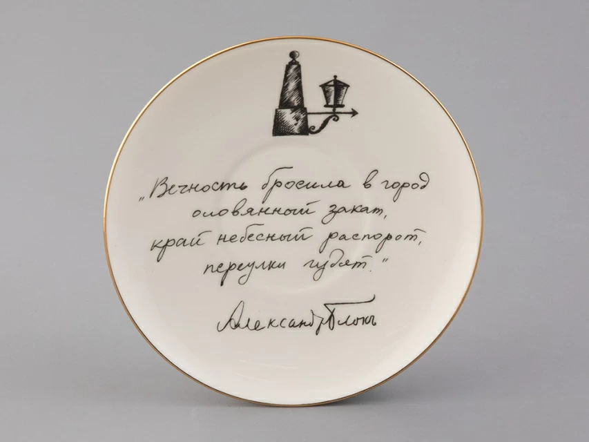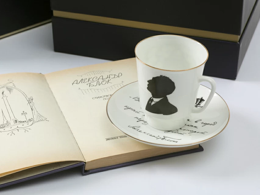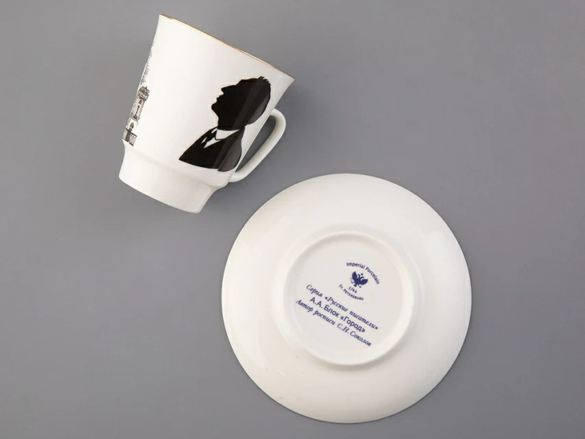 Кофейная пара стала продолжением популярной серии «Русские писатели» от Заслуженного художника РФ Сергея Соколова. Автор мастерски воплотил на фарфоре дух эпохи и своеобразие поэтической вселенной Александра Блока. Наследие Блока представлено художником через особую линию его лирики. В центре внимания – сборник стихов «Город» (1904–1908 гг.). Нетрудно догадаться, что речь идет именно о Санкт-Петербурге, чье влияние на творчество Блока невозможно переоценить. На чашке автор запечатлел силуэт поэта и одну из достопримечательностей – Мост Ломоносова (в начале XX века – Чернышев мост). Этот архитектурный памятник практически полностью сохранил свой первоначальный облик и стал важной частью художественного замысла Сергея Соколова. На блюдце размещены автограф поэта и строки из вышеупомянутого сборника: Вечность бросила в город Оловянный закат. Край небесный распорот, Переулки гудят. |
