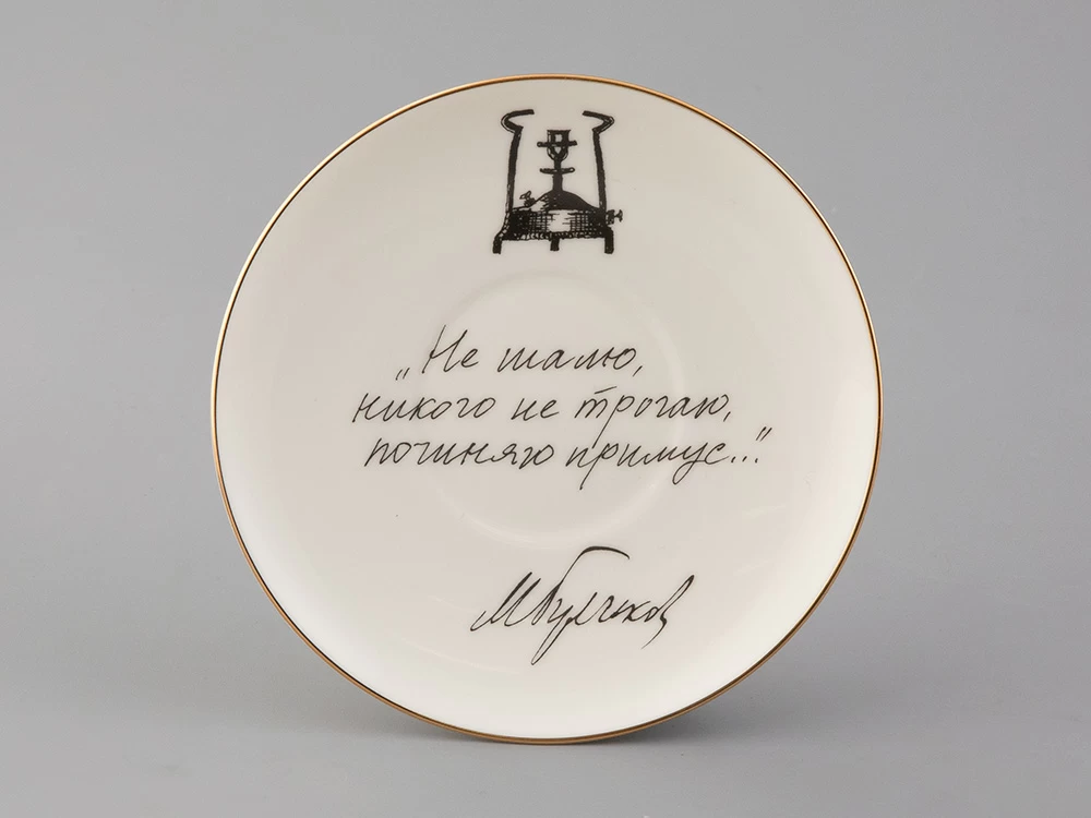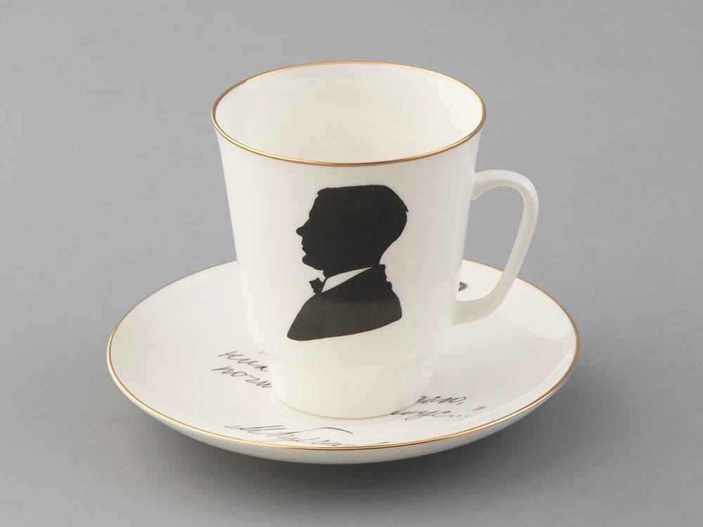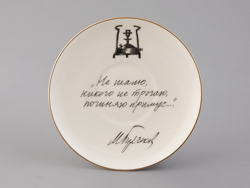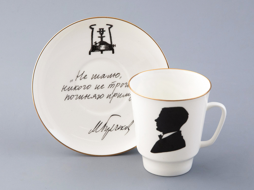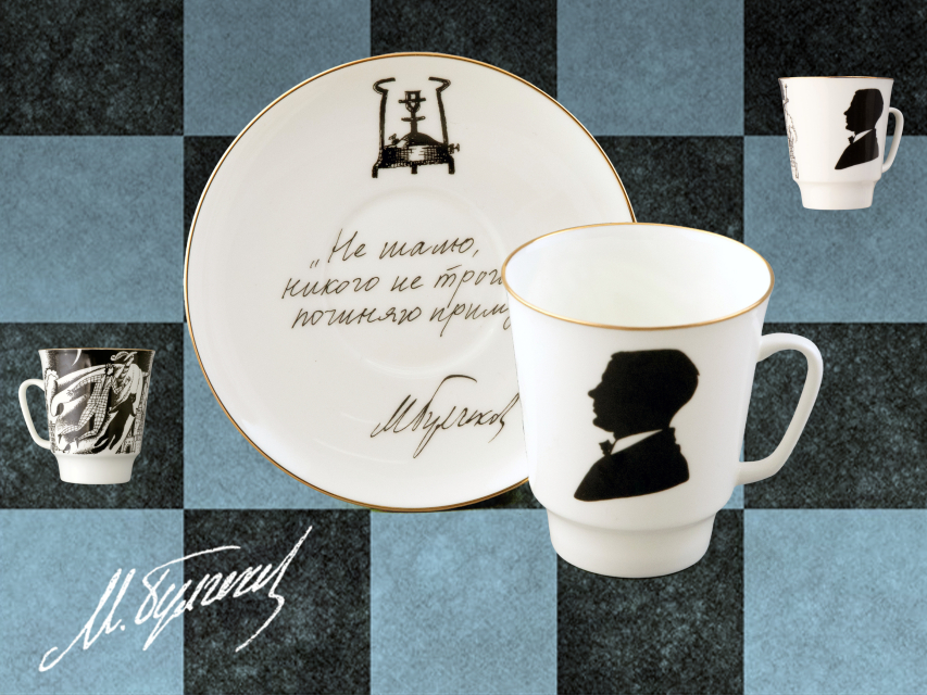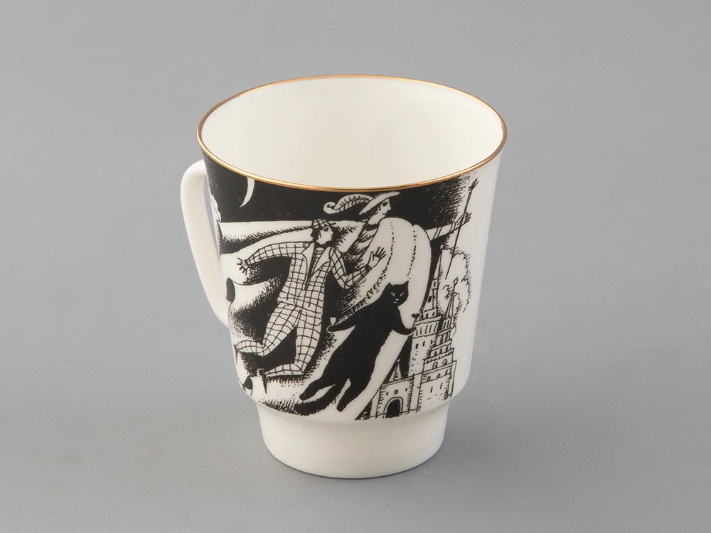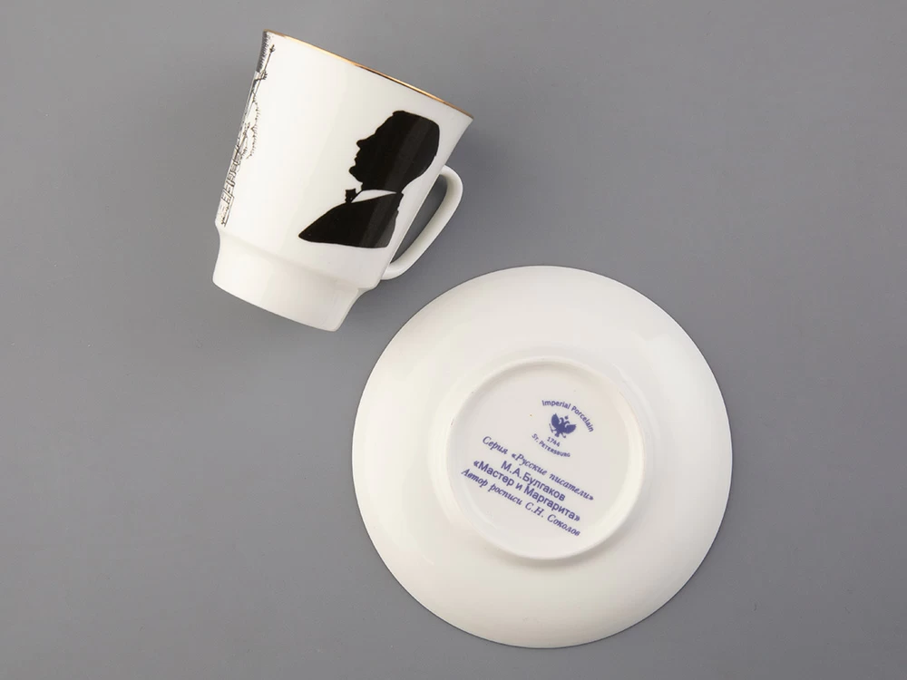 Кофейная пара стала продолжением популярной серии «Русские писатели» от Заслуженного художника РФ Сергея Соколова. Михаила Афанасьевича Булгакова по праву называют самым мистическим отечественным писателем XX столетия. Его бессмертный роман «Мастер и Маргарита» остаётся культовым произведением, притягивающим читателей разных поколений. Именно этому шедевр отразил в декоре кофейной пары Сергей Соколов. На чашке появляется силуэт самого писателя, окружённый персонажами его знаменитого романа. Здесь мы видим величественную фигуру Воланда, а рядом с ним – его свиту: Коровьева и кота Бегемота. Эти образы словно сходят со страниц романа, перенося зрителя в магический мир, полный тайн и неожиданностей. На блюдце художник разместил автограф писателя, а рядом с ним – цитату: «Не шалю, никого не трогаю, починяю примус…» Эта фраза, прозвучавшая из уст кота Бегемота, давно стала крылатым выражением. |