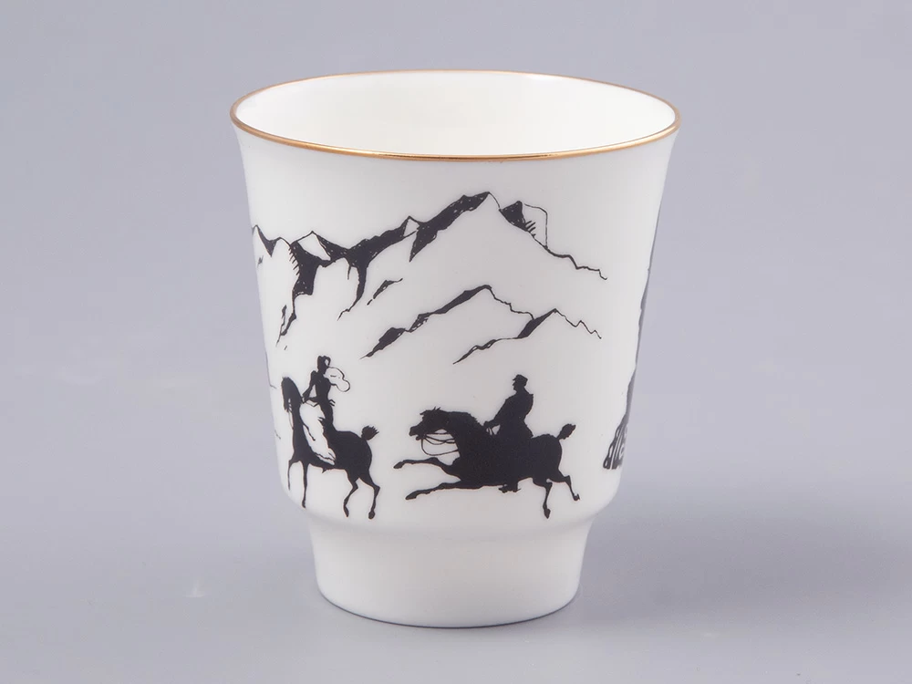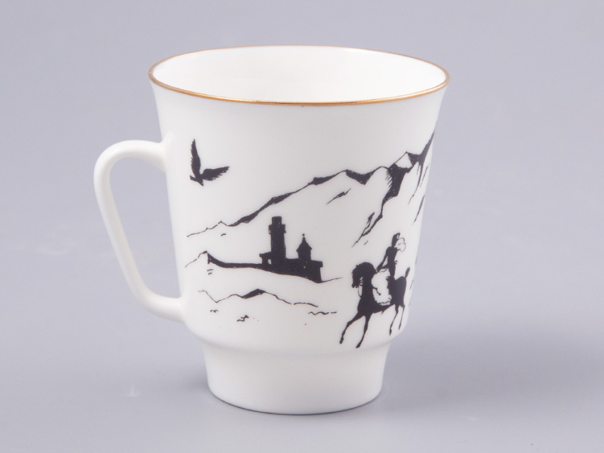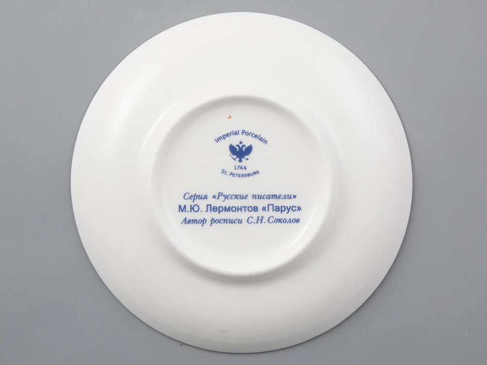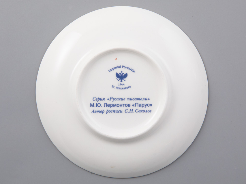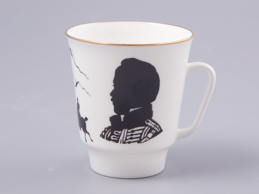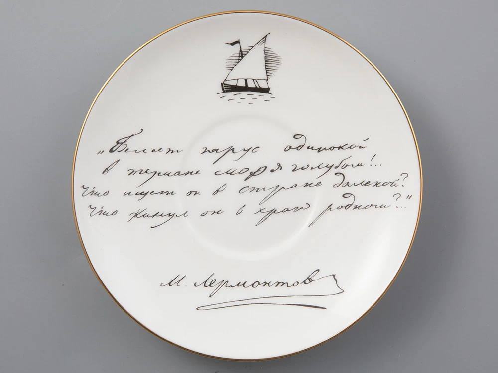 Другая сторона – это Лермонтов-писатель, оставивший обширное творческое наследие. На чашке можно увидеть силуэты Печорина с Мери на фоне гор Кавказа – это собственные, с набольшими изменениями, зарисовки писателя к роману «Герой нашего времени». На блюдце Сергей Соколов расположил знакомые всем с детства строки – фрагмент стихотворения «Парус», где Лермонтов рассуждает на тему одиночества, поиска, загадочности человеческой души.