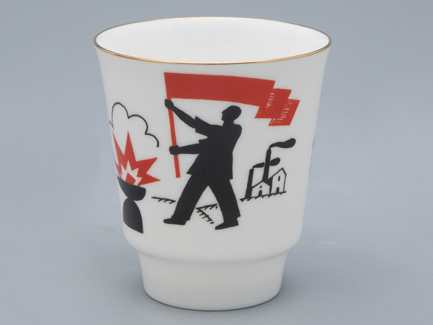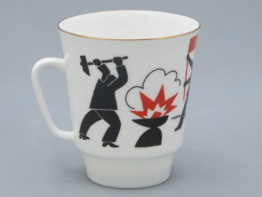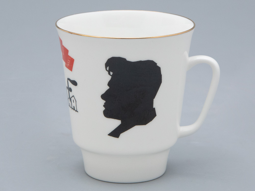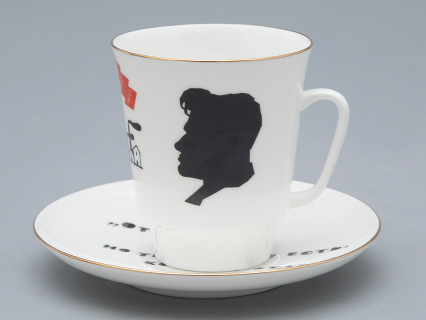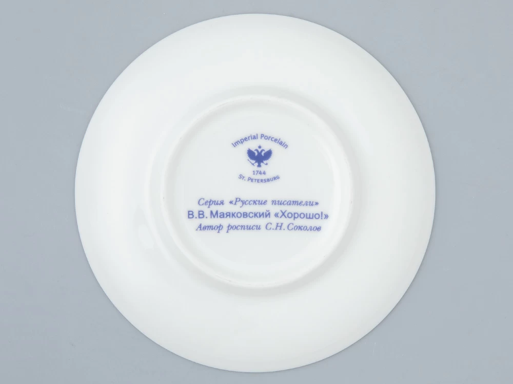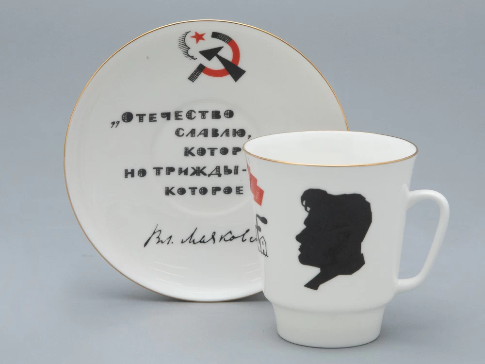 Кофейная пара из серии «Русские писатели» посвящена Владимиру Маяковскому. Композиция на чашке представляет собой силуэтное изображение поэта и его рисунки, выполненные для «Окон сатиры РОСТА» в 1919 году. На блюдце художник расположил серп и молот – символ единства рабочих и крестьян, автограф Маяковского и строки из поэмы «Хорошо!»: «Отечество славлю, которое есть, но трижды – которое будет!».