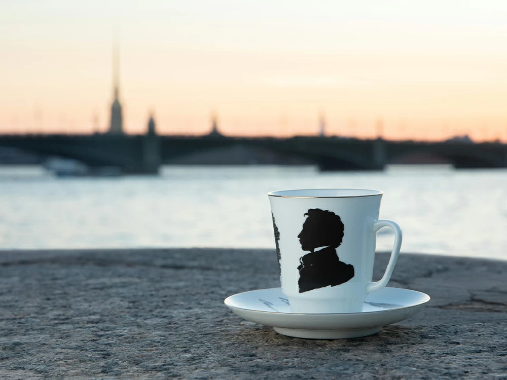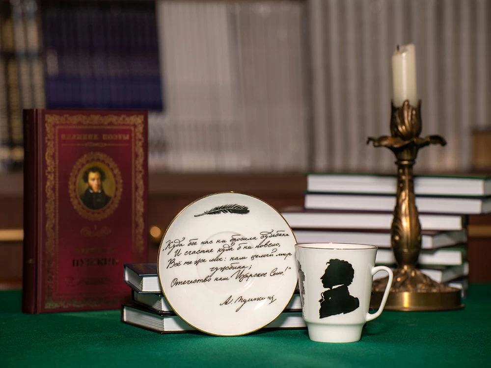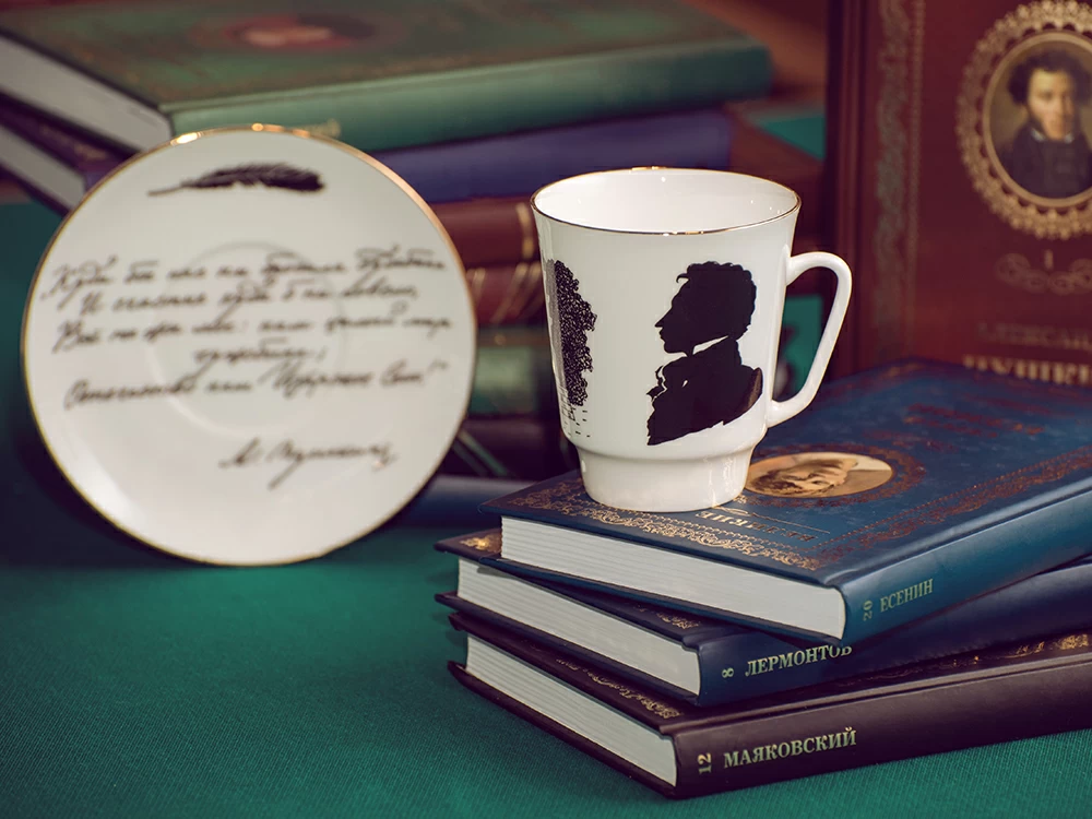 Кофейная пара из серии «Русские писатели» посвящена Александру Сергеевичу Пушкину. Поэтический дар Пушкина расцвел в Царском Селе: именно это место поэт чтил особо и упоминал во многих своих произведениях. В качестве основного декоративного мотива кофейной пары Сергей Соколов использует силуэты писателя в садах Царского Села, Чесменской колонны, а также гусиного пера, которым были написаны шедевры «солнца русской поэзии». На блюдце художник расположил строки из стихотворения «19 октября», посвященного Пушкиным дню Императорского Царскосельского Лицея: