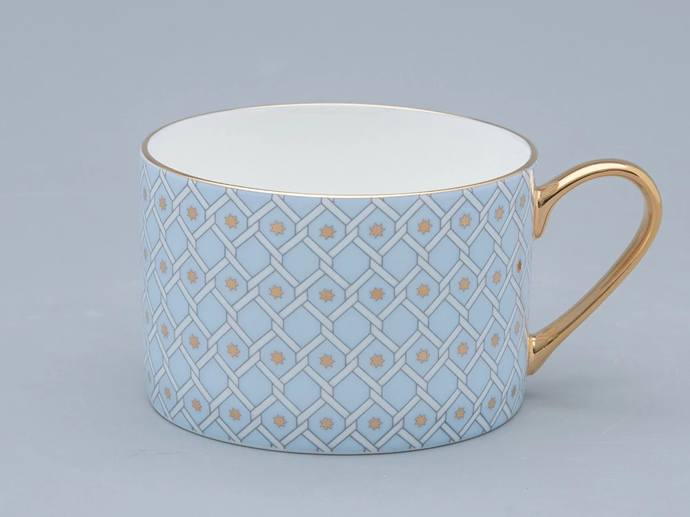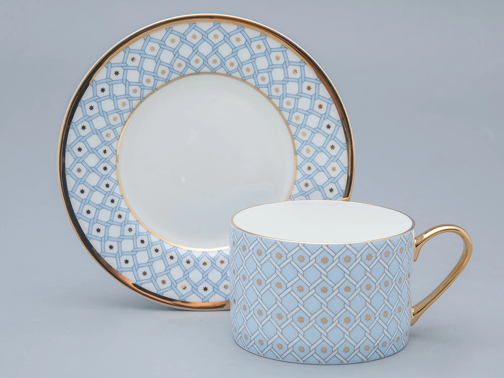 Чашка с блюдцем «Азур» отличаются изысканным декором, представляющим собой современную вариацию на тему знаменитой росписи Императорского фарфорового завода «Кобальтовая сетка», прототипом которой, в свою очередь, является Собственный сервиз Елизаветы Петровны середины XVIII века.