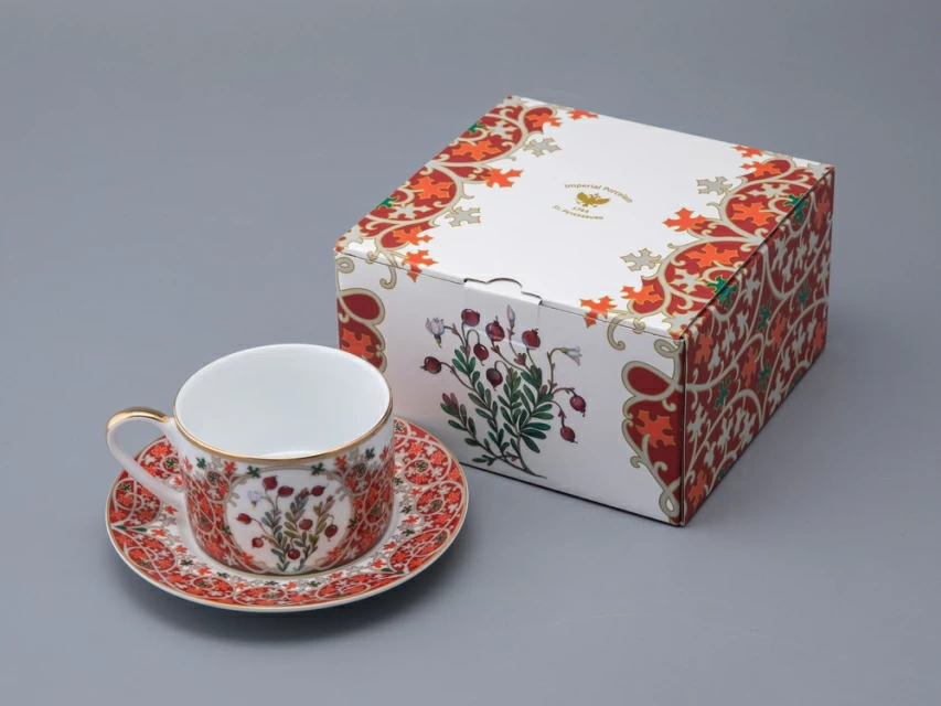 Чайная пара «Клюква заповедная» вошла в продолжение коллекции «Цветы и ягоды России» от художника Ольги Будашовой. В своих работах автор зачастую изображает цветы и дары природы, – такой декор остается вне времени. Используя растительные мотивы, Ольга Будашова создает предметы, которые сочетают в себе искусство и практичность. Композиция на фарфоре, выполненная в эстетике винтажных ботанических иллюстраций, дополнена орнаментальным узором – авторским размышлением на тему национальной вышивки.