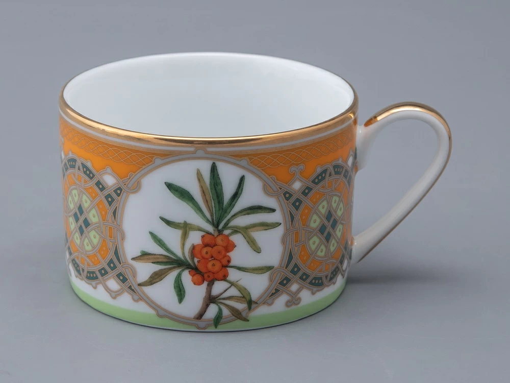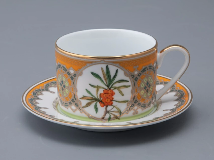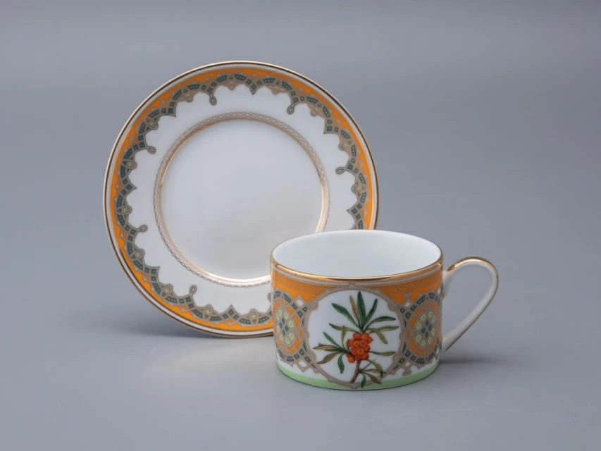Чайная пара «Облепиха сибирская» вошла в продолжение коллекции «Цветы и ягоды России» от художника Ольги Будашовой. В своих работах автор зачастую изображает цветы и дары природы, – такой декор остается вне времени. Используя растительные мотивы, Ольга Будашова создает предметы, которые сочетают в себе искусство и практичность. Композиция на фарфоре, выполненная в эстетике винтажных ботанических иллюстраций, дополнена орнаментальным узором – авторским размышлением на тему национальной вышивки.