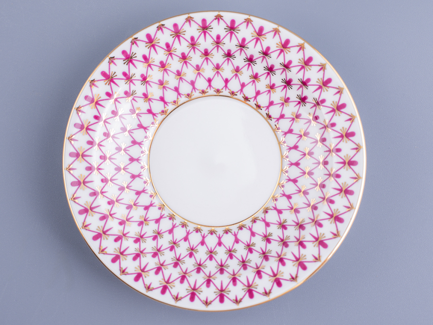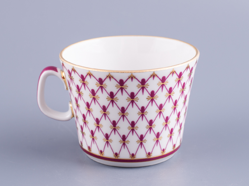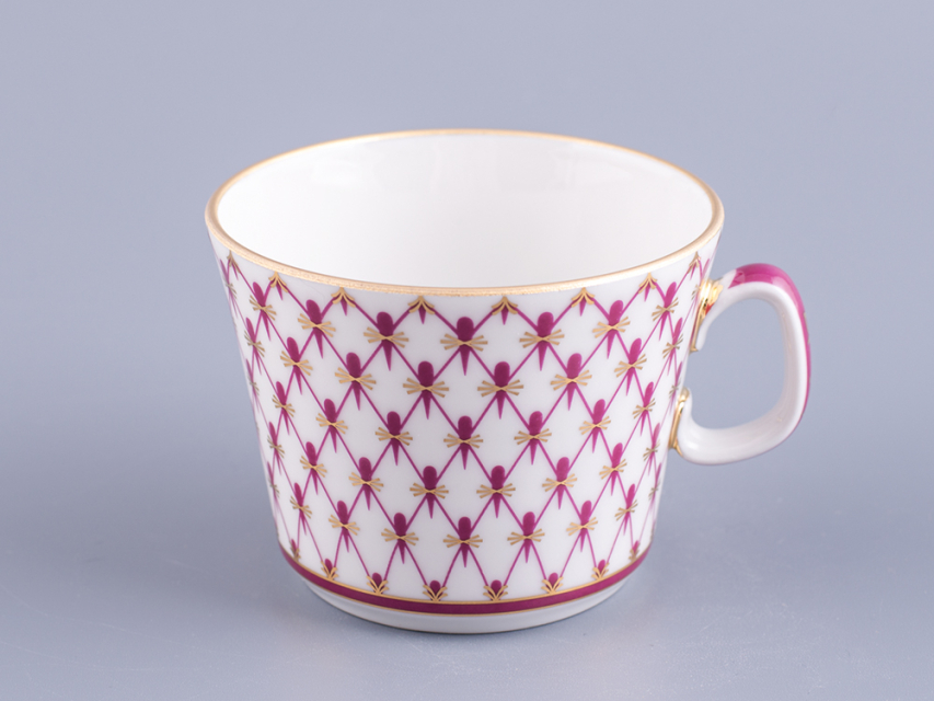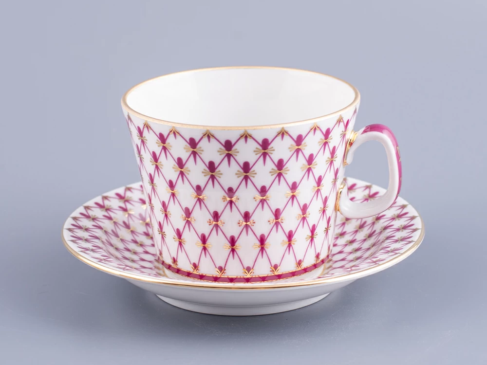 Чашка с блюдцем изготовлена на Императорском фарфоровом заводе из твердого фарфора. Для декорирования используется надглазурная деколь, роспись золотом. Автор рисунка - Галина Шуляк, автор формы - Анна Лепорская. Объем чашки - 200 мл, высота - 5.8 см.