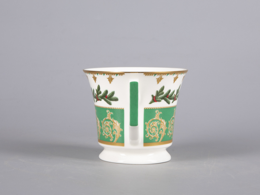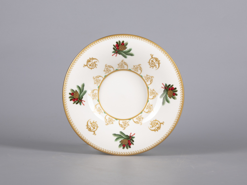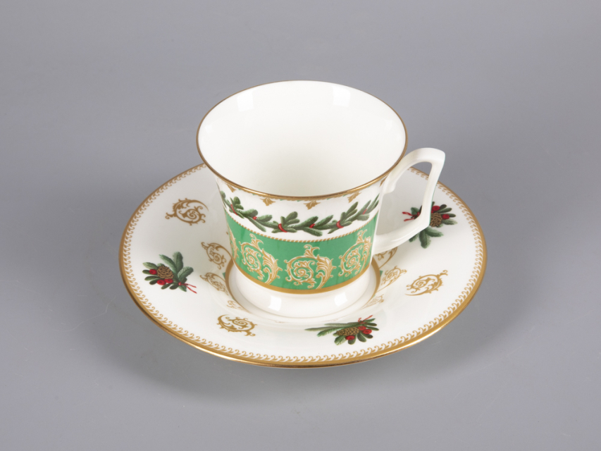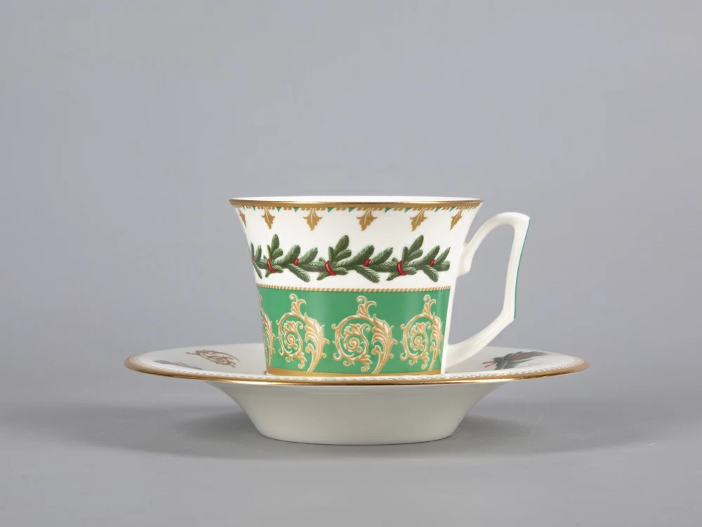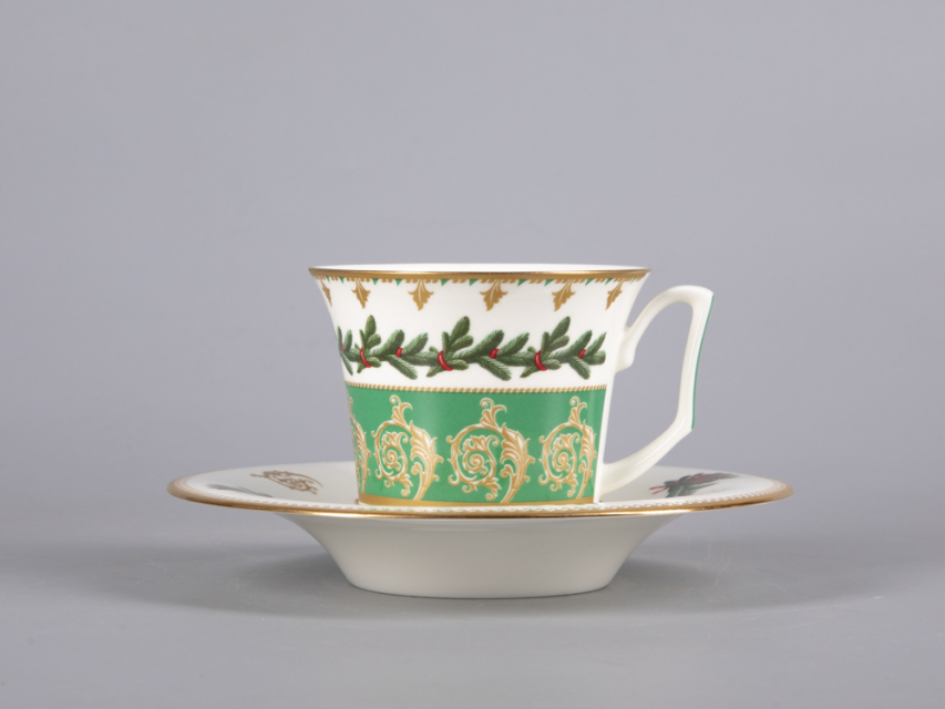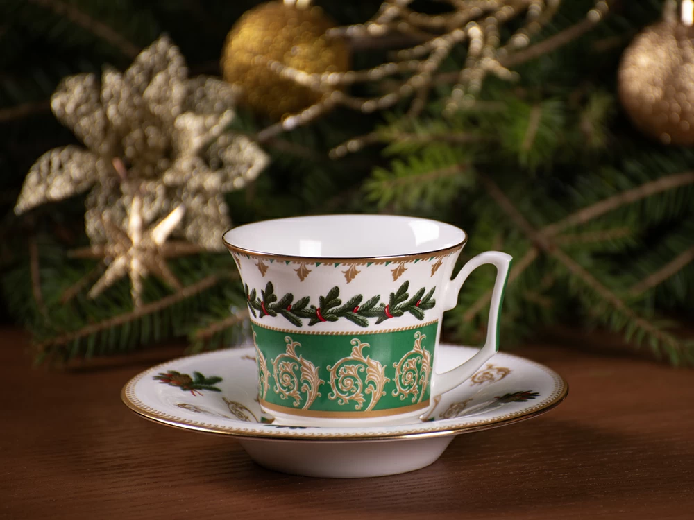 На чайной паре из белоснежного костяного фарфора распустился пышный еловый венок, пленяющий своей красотой. Круговая композиция строится на сочетании растительной росписи с орнаментальными мотивами. Богатые золотые акцента усиливают декоративный эффект, что сделает чайную пару желанным подарком к празднику.