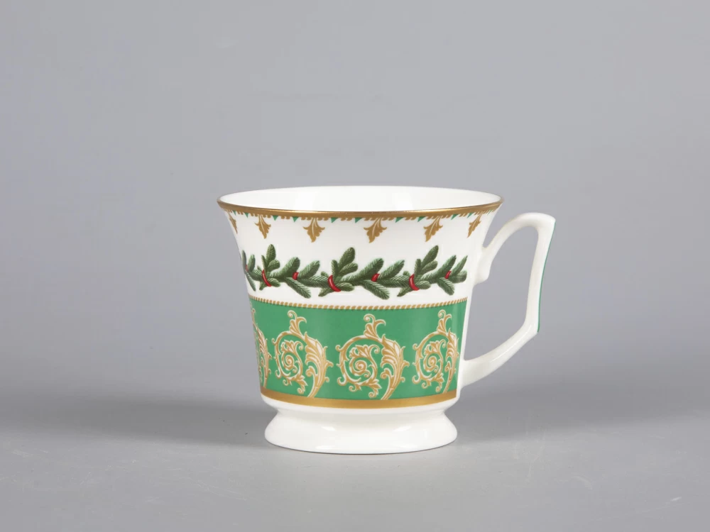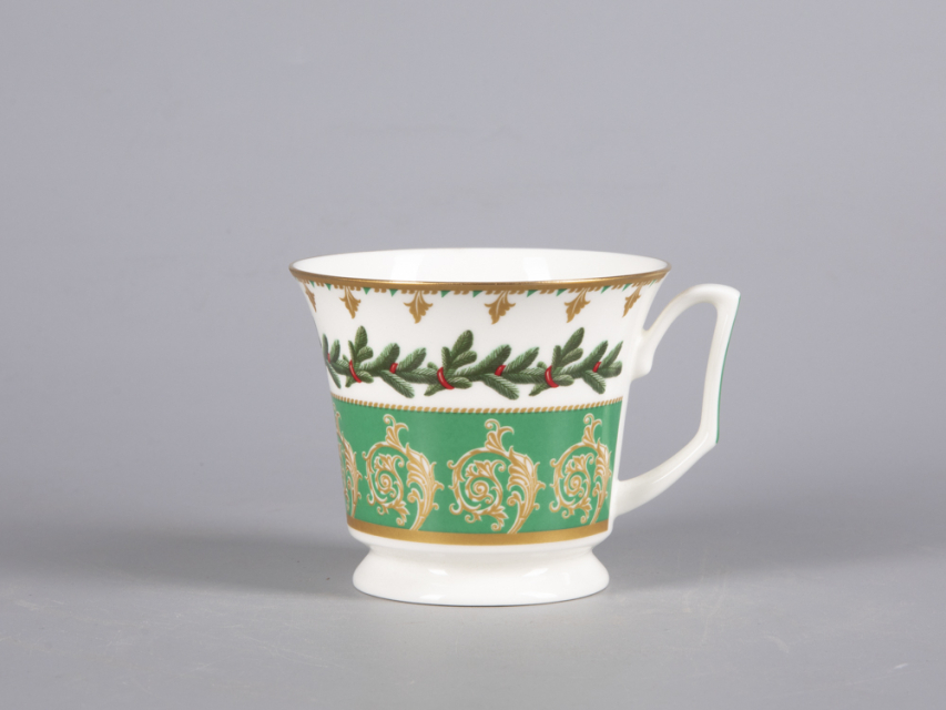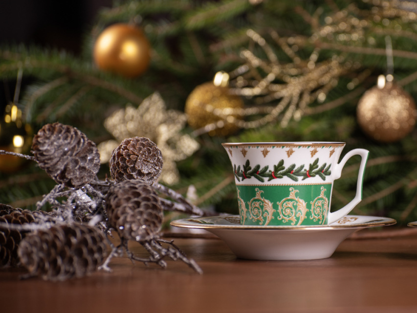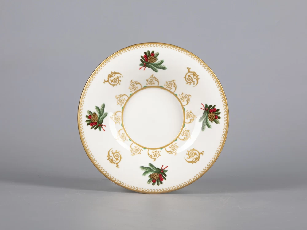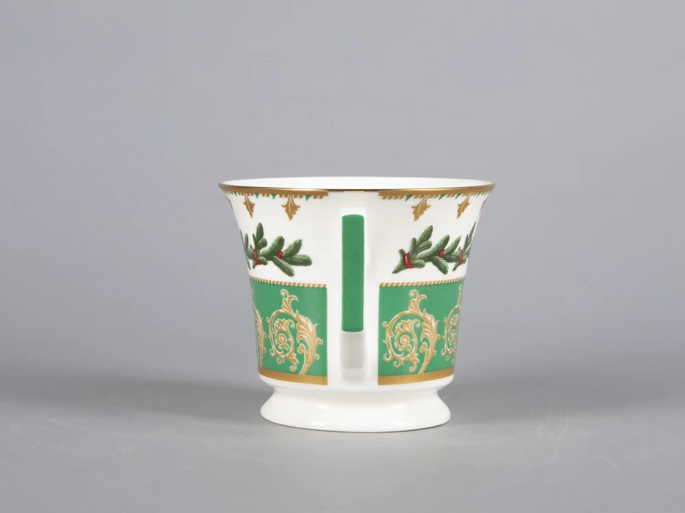 На чайной паре из белоснежного костяного фарфора распустился пышный еловый венок, пленяющий своей красотой. Круговая композиция строится на сочетании растительной росписи с орнаментальными мотивами. Богатые золотые акцента усиливают декоративный эффект, что сделает чайную пару желанным подарком к празднику.