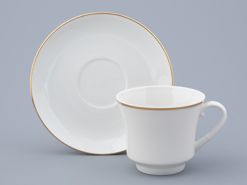 Лаконичный декор чайной пары «Золотая лента» выполнен вручную золотосодержащими красками и позволяет оценить декоративные качества материала и достоинства формы.