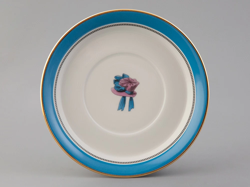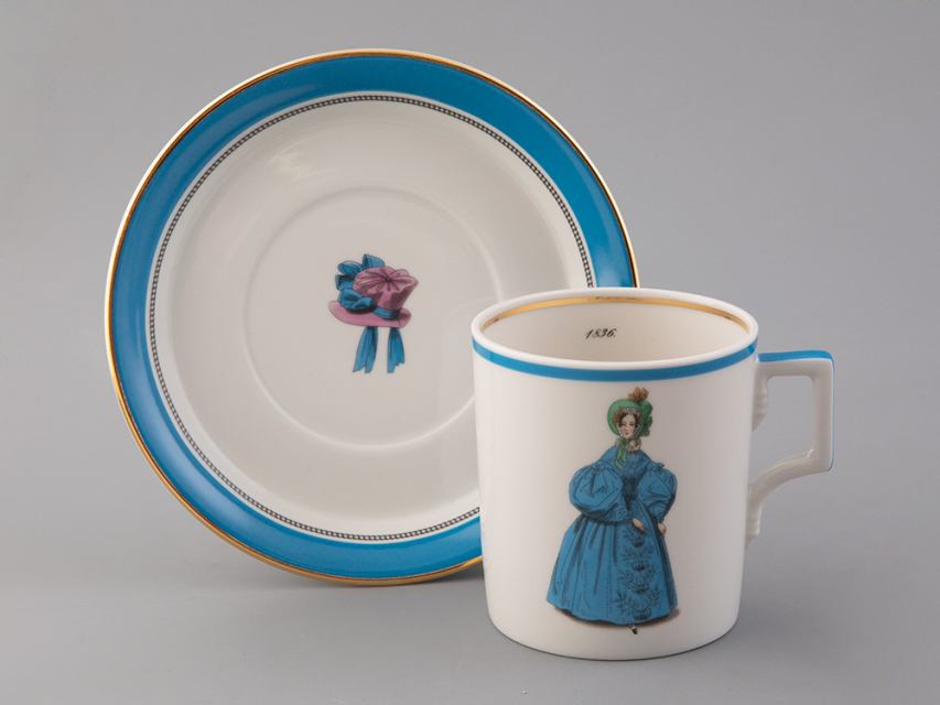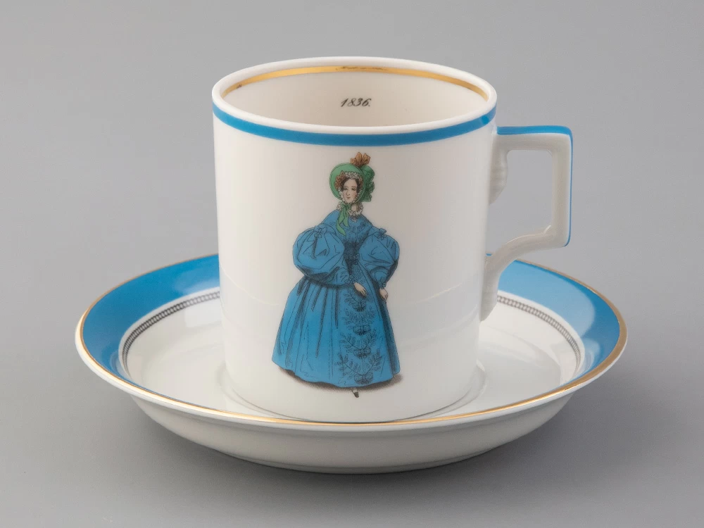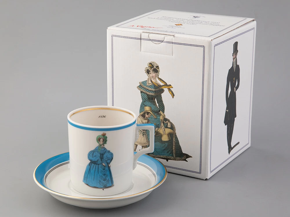 Чайная чашка с блюдцем «Modes de Paris 1836» на форме «Гербовая» из коллекции «Прелестница», созданной в рамках совместного проекта с известным историком моды - Александром Васильевым.