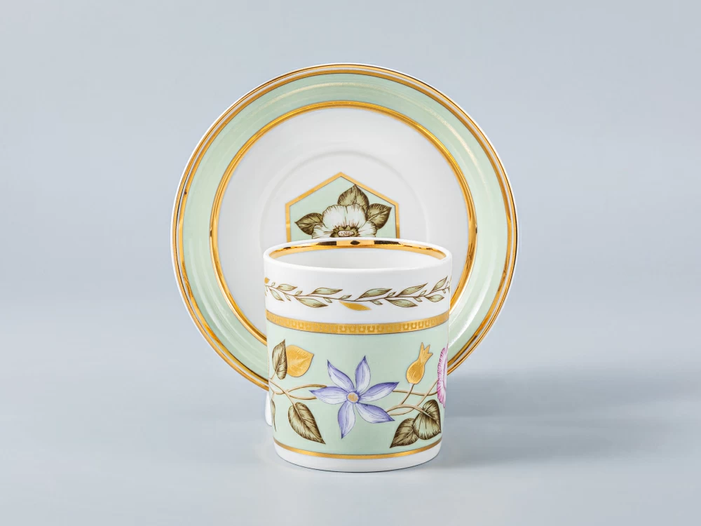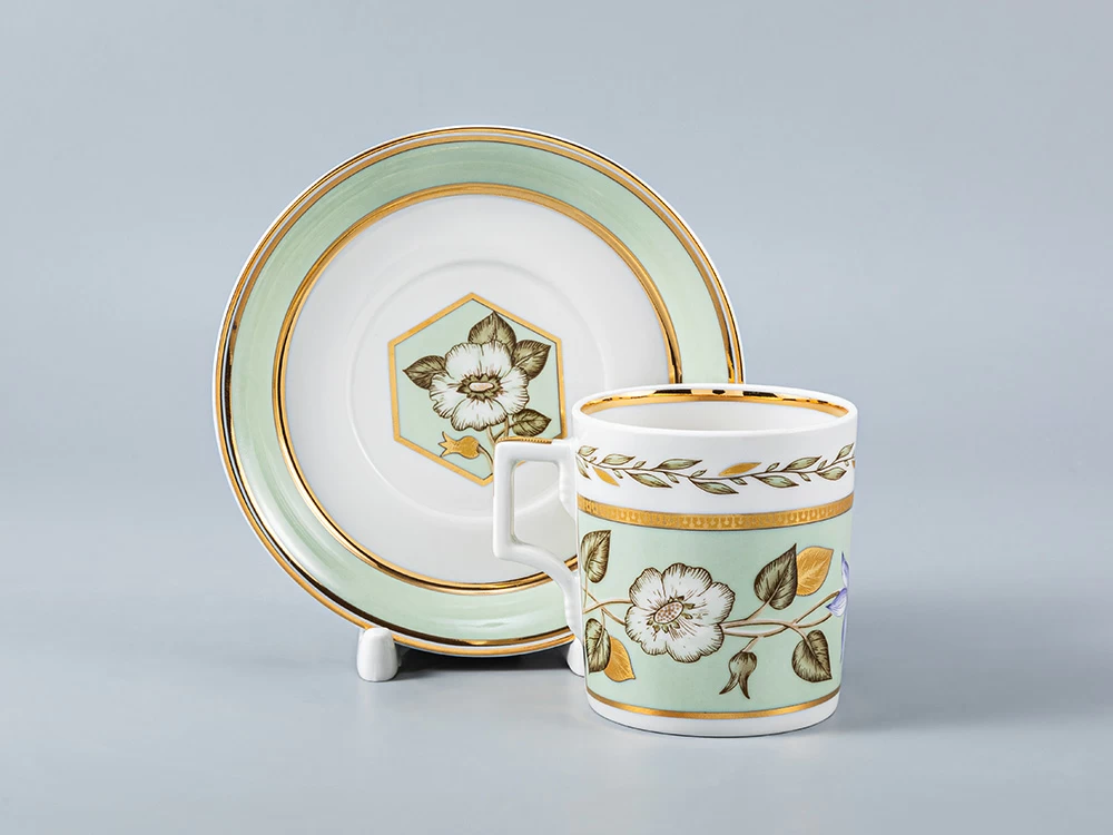 В росписи этой чайной пары художник Леввович Л.Г. использовала тонкий цветочный живописный узор, свободно расположенный на нежном нефритовом фоне. Стилизованные цветочные стебли на сервизных предметах, соединенные легким орнаментом и дополненные золотыми графическими украшениями, создают неожиданно легкий, светлый образ вещи, подчеркивают изящество и благородство белизны фарфора.